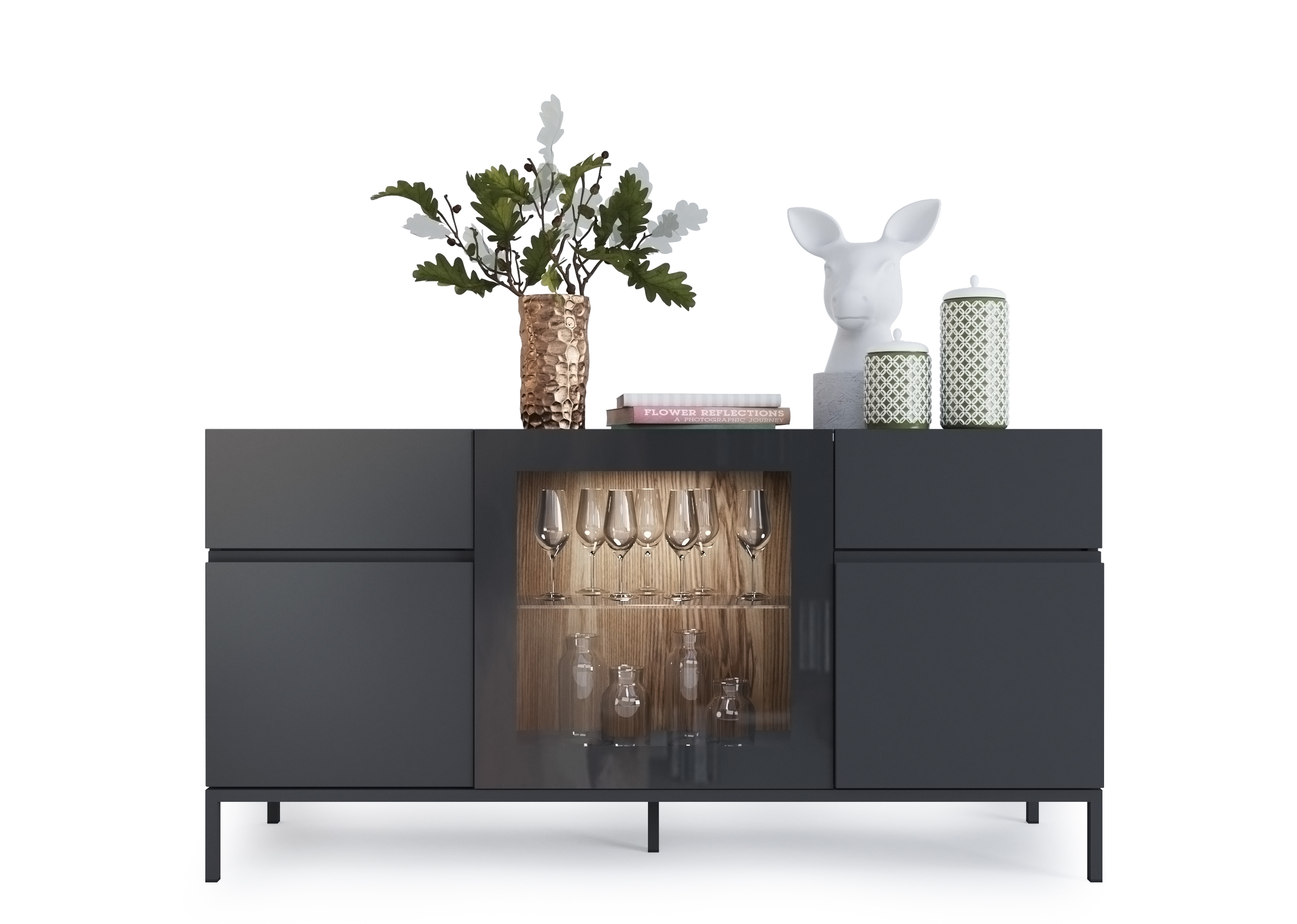 Compuesto por 2 puertas batientes izquierda y derecha, una puerta de vitrina central y 2 cajones.