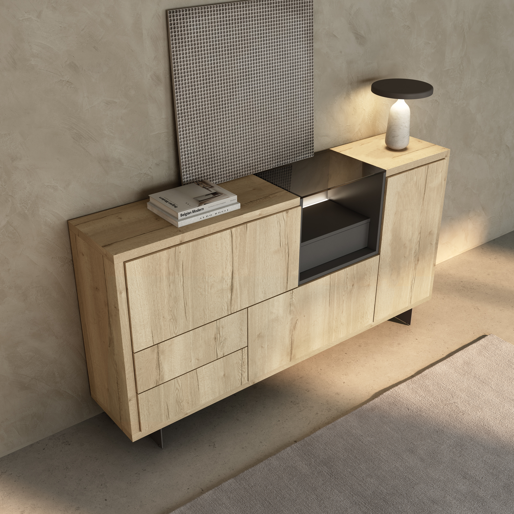 Aparador 1 puerta batiente, 2 puertas abatibles, 3 cajones y hueco con bandeja de cristal.