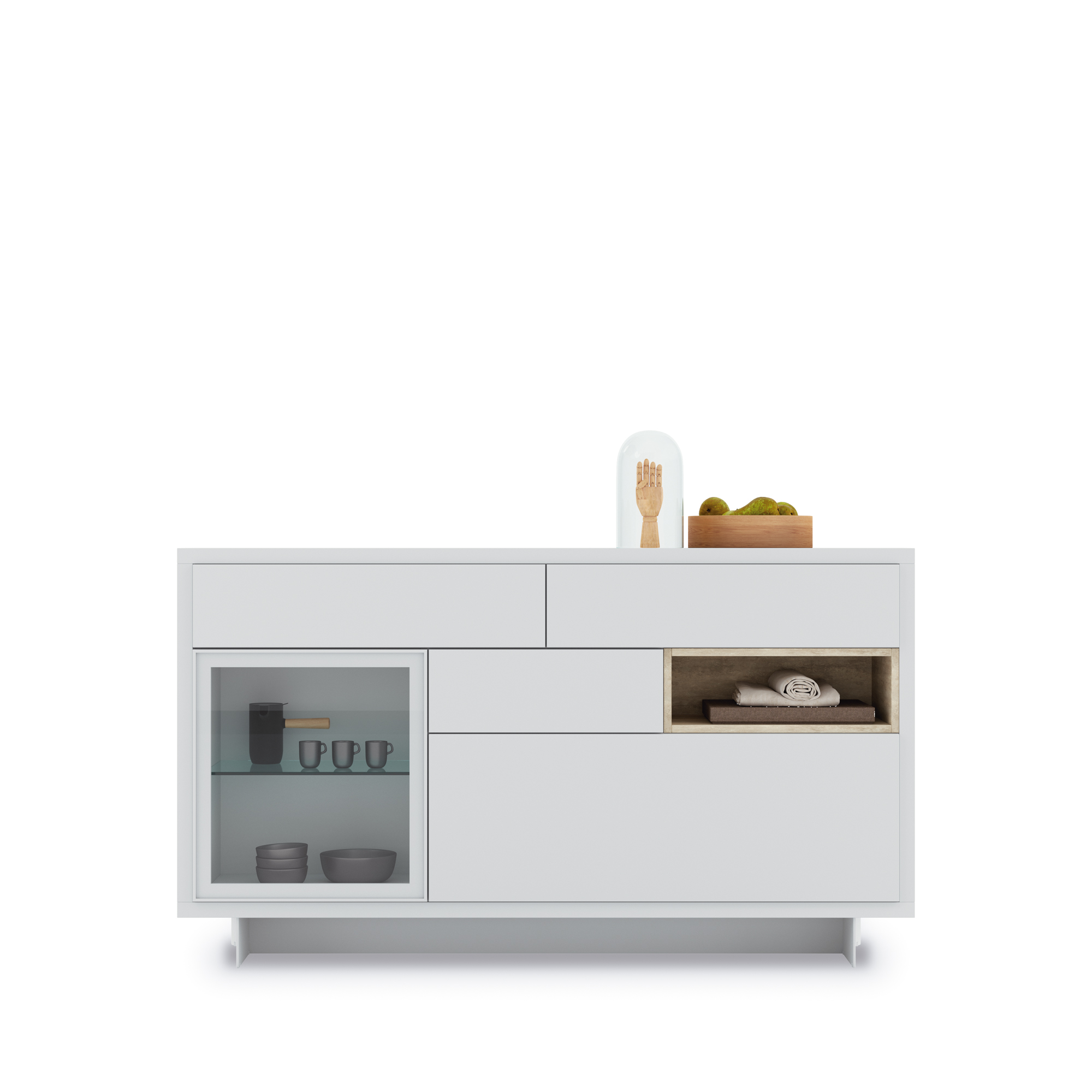 Aparador 1 puerta vitrina, 1 puerta abatible,3 cajones y un hueco.