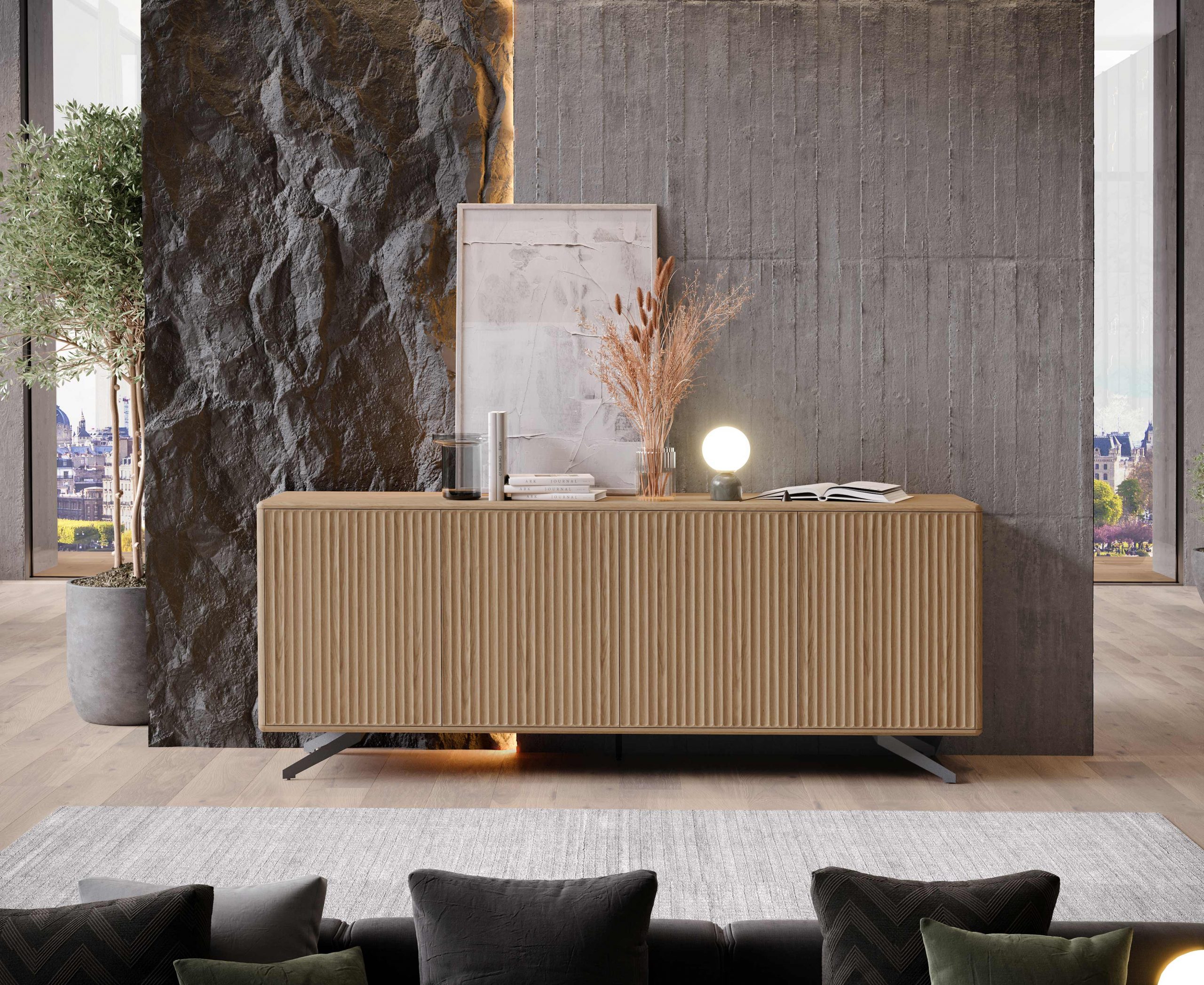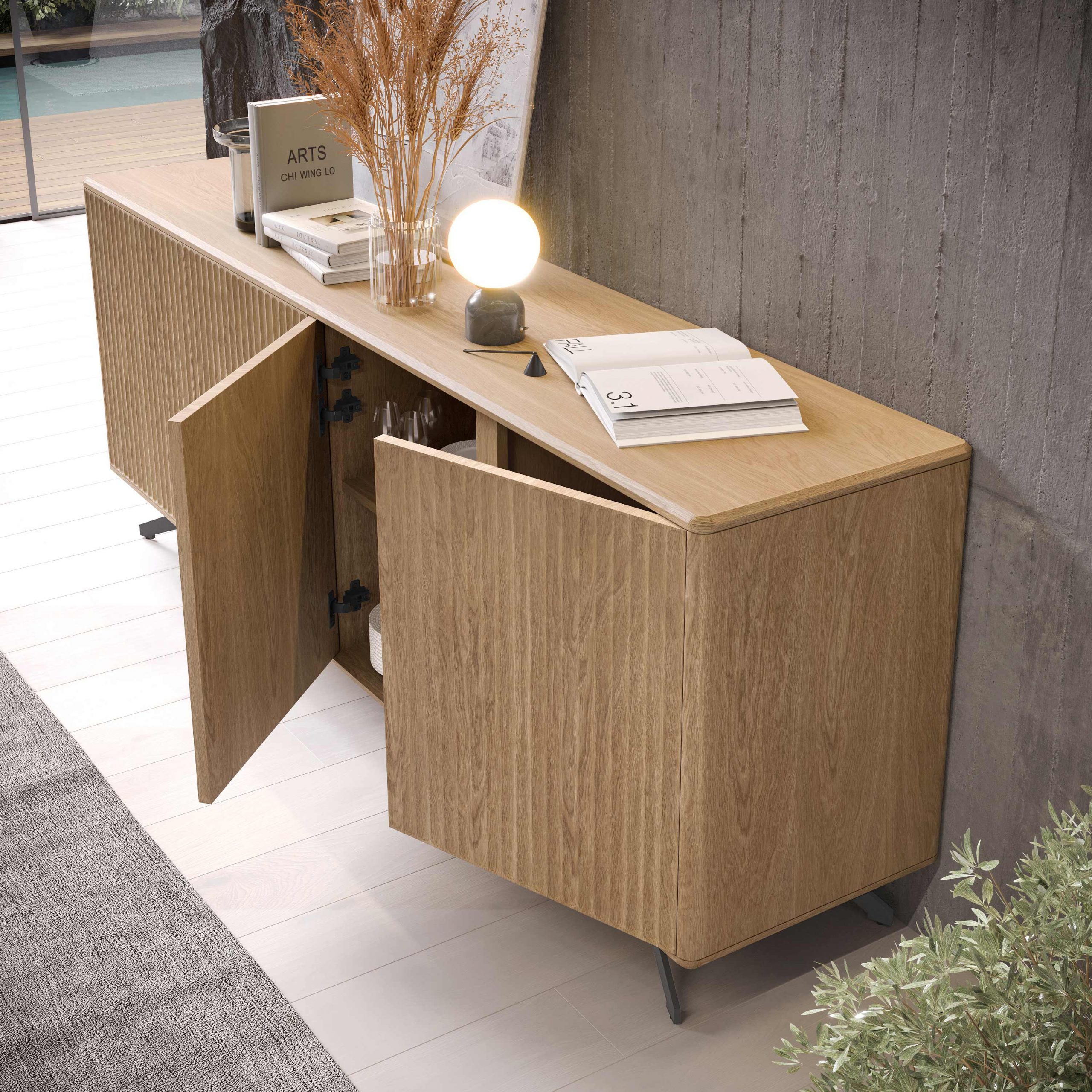 Fabricado en chapa natural con acabados NCP.42 y metal gris, el Aparador Costa Galia 04 garantiza resistencia, durabilidad y una terminación impecable. Los materiales de primera calidad aseguran una larga vida útil y un mantenimiento sencillo, manteniendo su belleza con el paso del tiempo.
