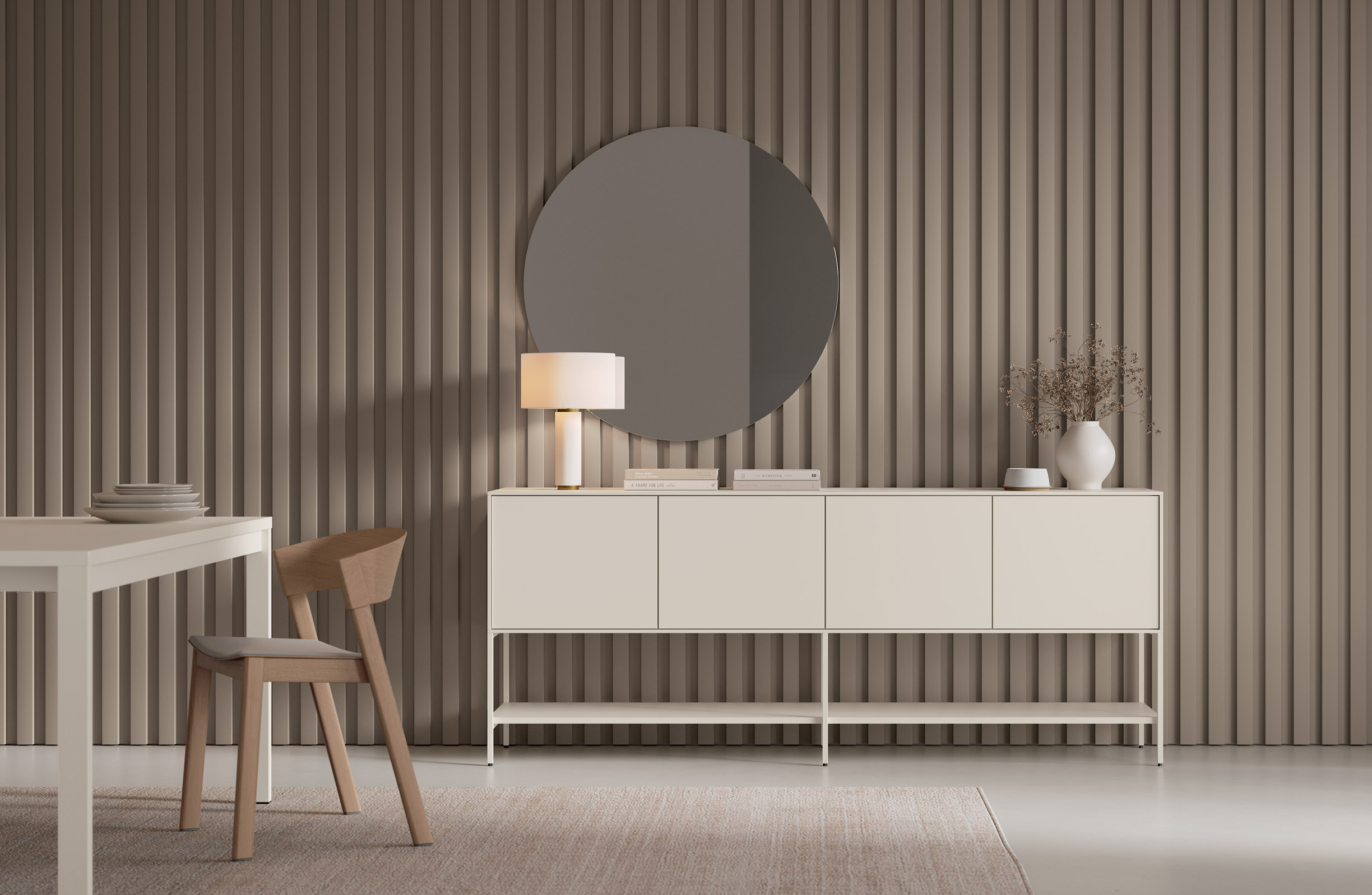 Aparador 4 puertas con estructura de metal a color y 2 estantes inferiores.