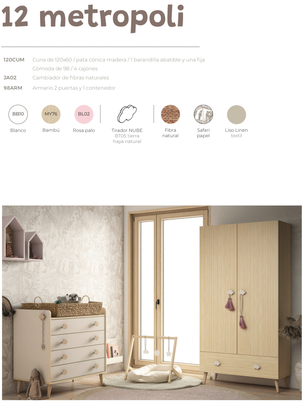 La Composición 12 Ros destaca por su diseño en blanco, bambú y rosa palo, con tiradores nube en tierra y haya natural. Esta combinación de tonos suaves transmite calidez y delicadeza. Además, es un conjunto pensado para cubrir todas las necesidades del bebé y facilitar la organización diaria.