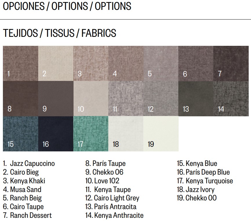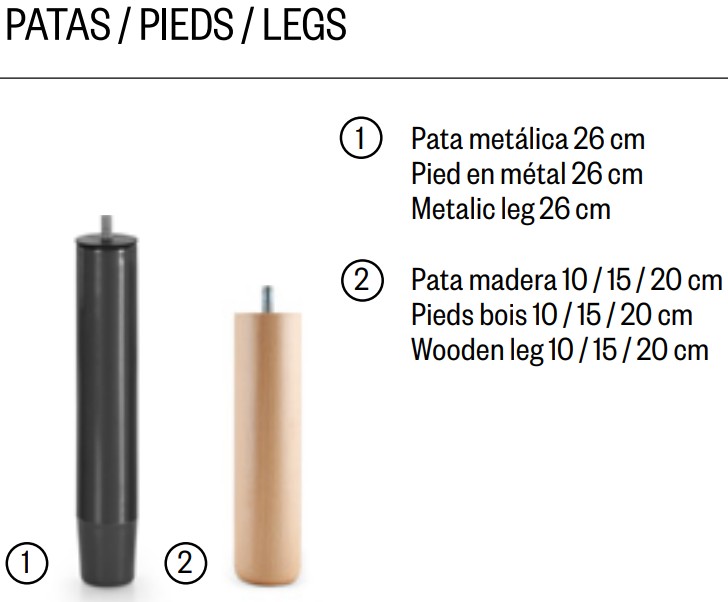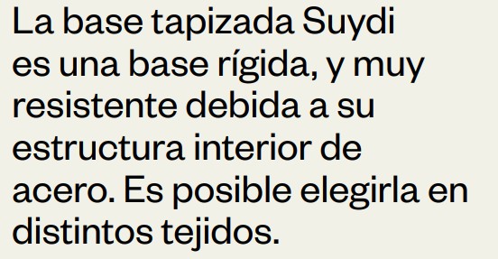 Por otro lado, la base Suydi permite una amplia personalización según las preferencias del usuario. Se puede elegir entre patas metálicas de 26 cm o patas de madera en alturas de 10, 15 o 20 cm, adaptándose a diferentes estilos y necesidades de decoración. Además, está disponible en varios tejidos y colores, lo que permite integrarla fácilmente en cualquier dormitorio.