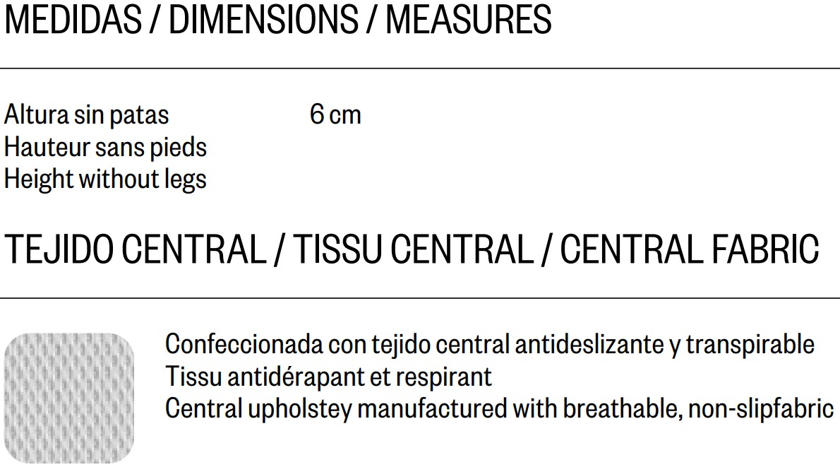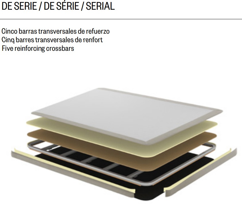 La altura de la base sin patas es de 6 cm, lo que facilita su combinación con distintos modelos de colchones. Su estructura cuenta con cinco barras transversales de refuerzo, que proporcionan una mayor resistencia y estabilidad al conjunto.