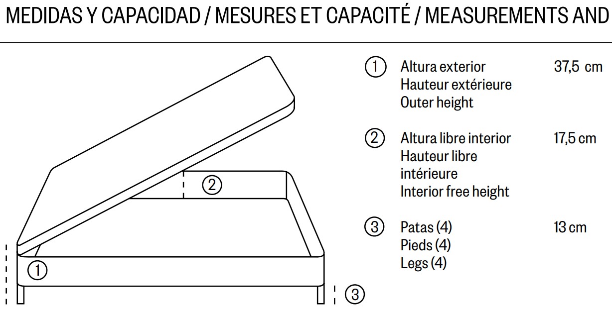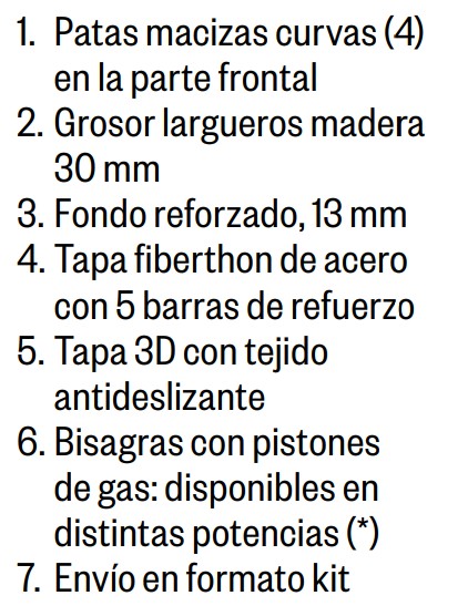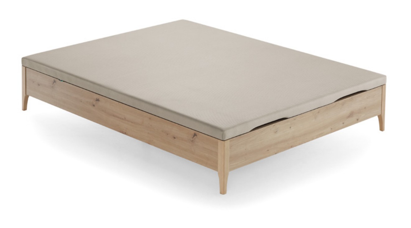 Por otro lado, su estructura de madera maciza con largueros de 30 mm garantiza estabilidad y durabilidad. El fondo reforzado de 13 mm añade firmeza, mientras que la tapa Fiberthon de acero con cinco barras transversales de refuerzo ofrece una base sólida para cualquier tipo de colchón. Su tejido 3D antideslizante y transpirable evita desplazamientos y mejora la ventilación, favoreciendo un descanso más fresco y saludable.