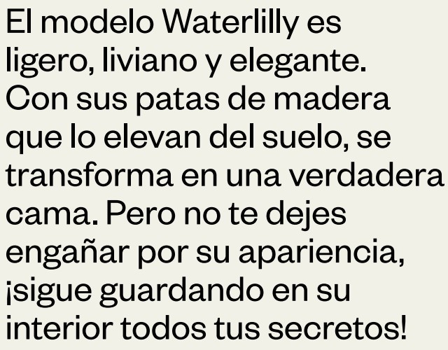 En resumen, el canapé abatible Waterlilly de Ecus es ligero, funcional y elegante. Su diseño elevado, su estructura sólida y su estilo natural lo convierten en una opción perfecta para quienes buscan confort y capacidad sin renunciar a la estética.