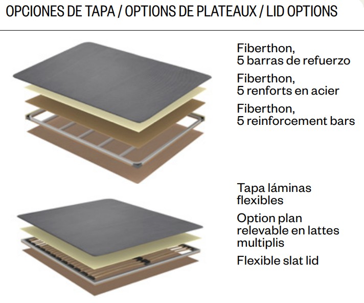 Dos tipos de tapa: Fiberthon reforzada o láminas flexibles, según la preferencia del usuario.