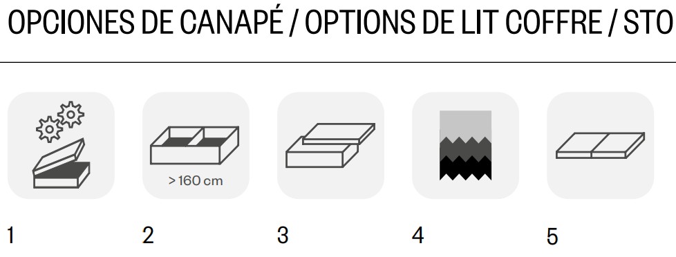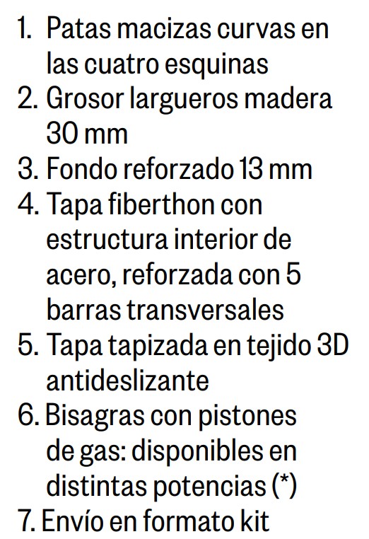 Su fondo reforzado de 13 mm y los largueros de madera de 30 mm de grosor confirman su resistencia y durabilidad. Además, las bisagras con pistones de gas, disponibles en distintas potencias, permiten una apertura suave y cómoda del cofre.