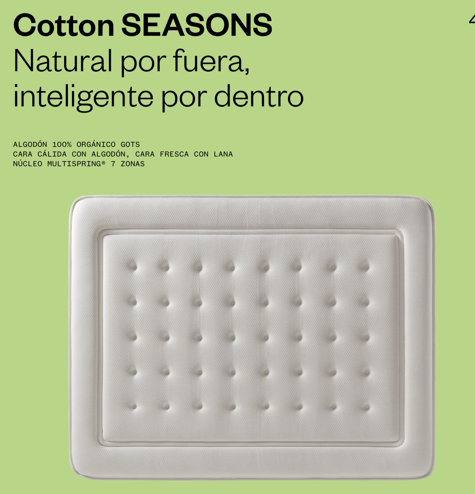 El Dublín Seasons también destaca por su versatilidad climática: la cara de invierno está recubierta de lana natural, que aporta aislamiento y calidez durante los meses fríos, mientras que la cara de verano utiliza algodón hidrófilo, un material fresco y transpirable que ayuda a mantener el descanso seco y agradable en épocas de calor.