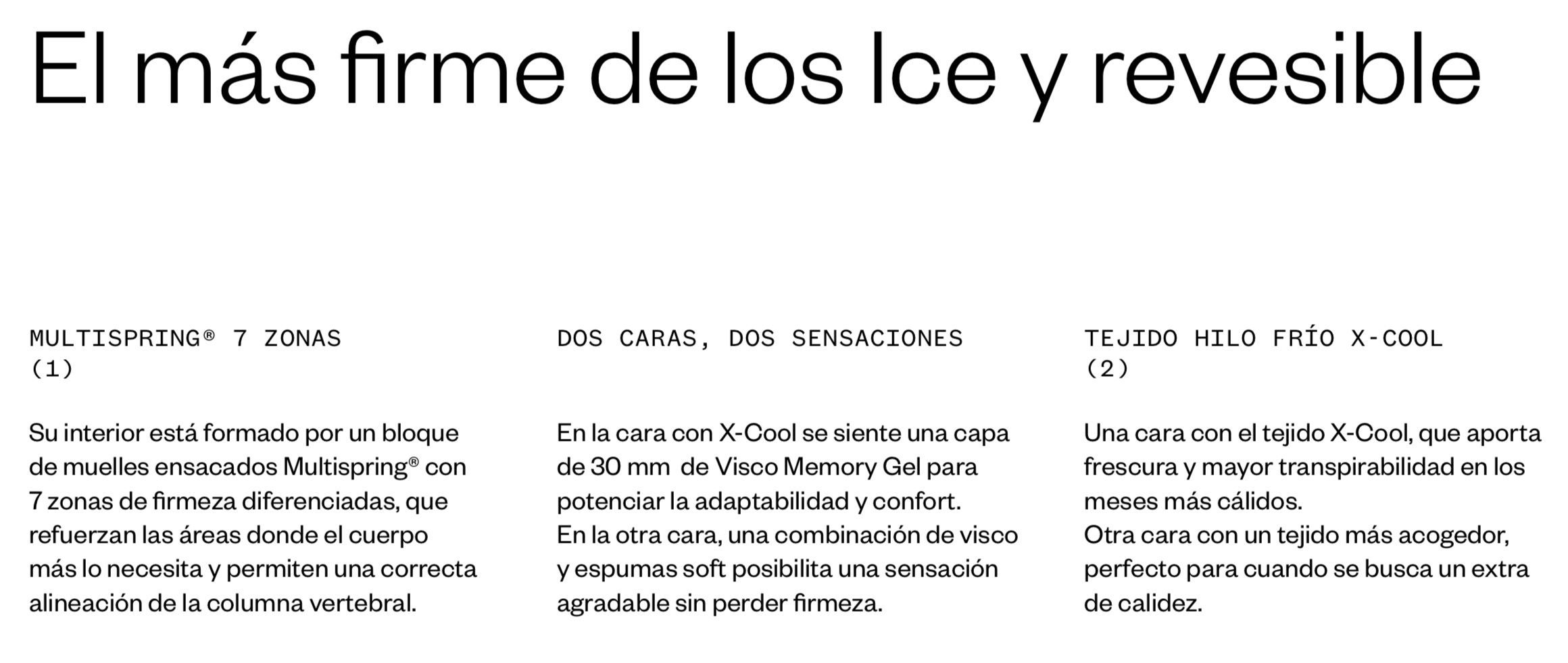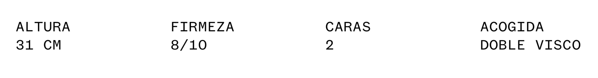 El acolchado doble cara multiplica las posibilidades. La cara con tejido X-Cool integra una capa de 30 mm de Visco Memory Gel, que potencia la adaptabilidad y mejora la circulación del aire. De este modo, se consigue un descanso más fresco y sin acumulación de calor. Por otra parte, la cara opuesta combina viscoelástica con espumas soft. Esta configuración genera una sensación más cálida y suave, sin perder firmeza ni estabilidad.