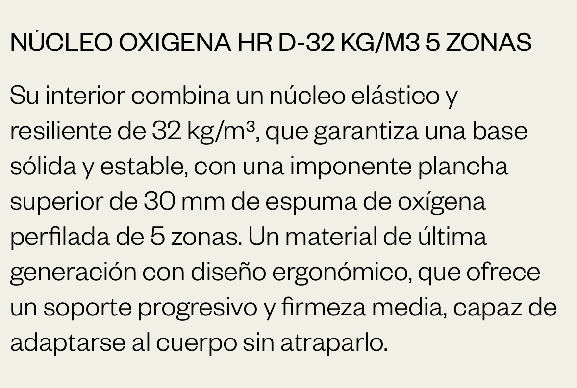Núcleo Oxígena HR 32 kg/m³ con 5 zonas ergonómicas.