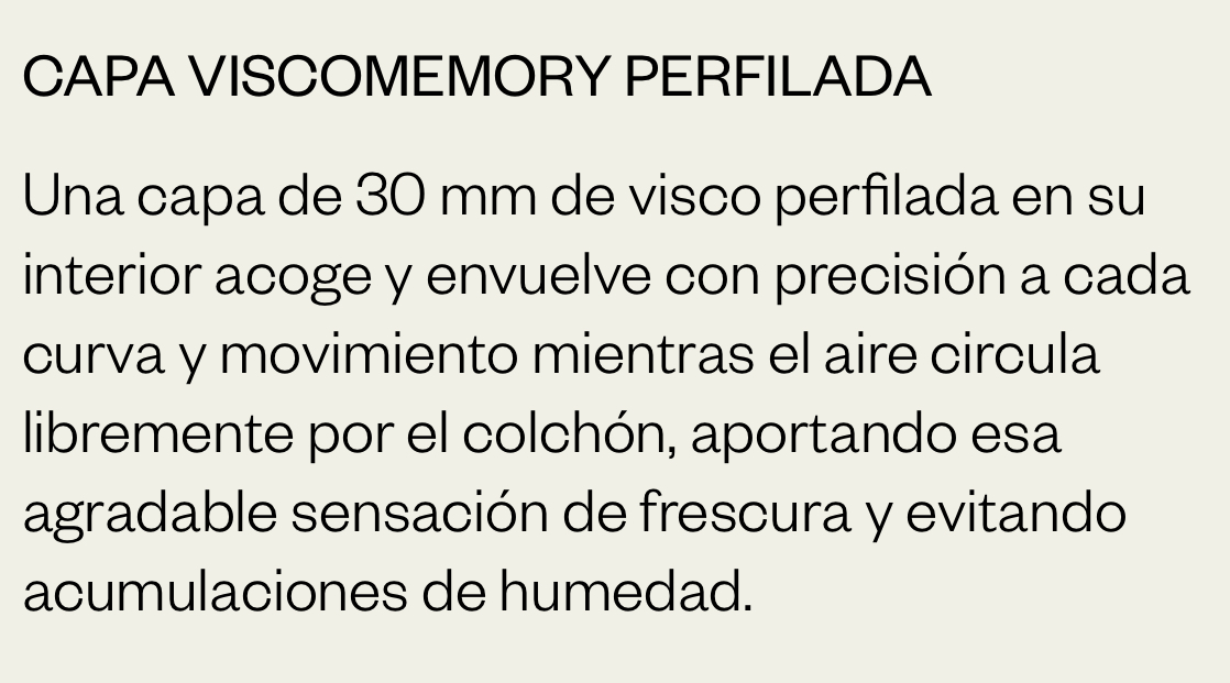 El núcleo se complementa con una plancha superior de espuma Oxígena perfilada de 30 mm, que mejora la ergonomía y potencia la transpirabilidad. Además, en su interior integra una capa de visco memory perfilada de 30 mm, que envuelve y alivia la presión en hombros, caderas y piernas. Gracias a su diseño, el aire circula libremente por el colchón, evitando acumulación de humedad y aportando una agradable sensación de frescor.