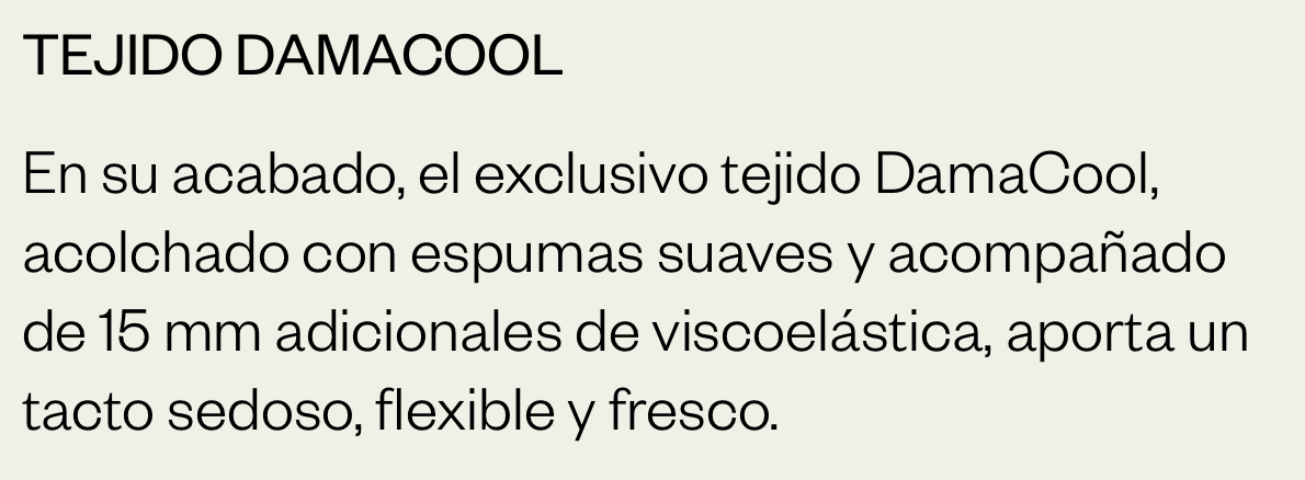 En su acabado exterior, el tejido Damacool añade frescura y suavidad. Está acolchado con espumas de alta calidad y 15 mm adicionales de viscoelástica, lo que proporciona un tacto sedoso, flexible y envolvente desde el primer contacto.