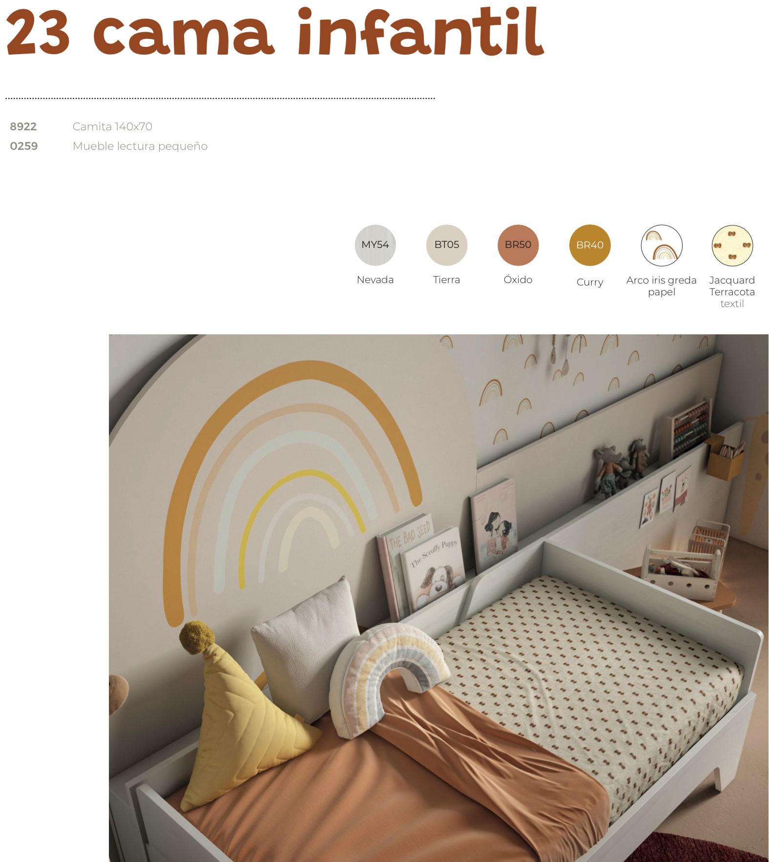 La Composición 23 Ros es un conjunto pensado para transformar el dormitorio infantil en un espacio acogedor, seguro y lleno de estilo. Sus acabados en colores nevada, tierra, óxido y curry aportan calidez y personalidad. Además, la selección de piezas combina mobiliario práctico con elementos decorativos únicos.