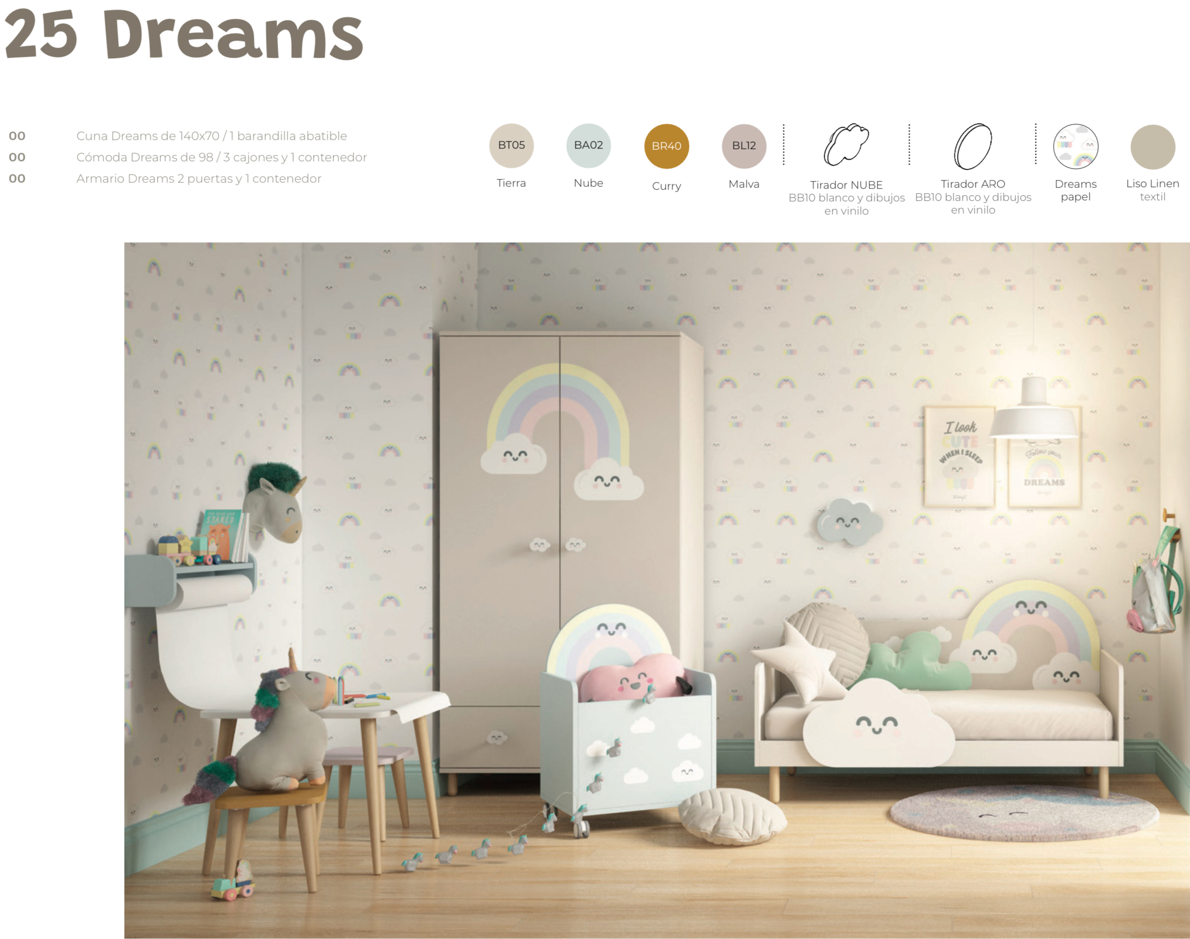 El mobiliario auxiliar está representado por el juguetero Dreams, la cómoda Dreams y el armario Dreams, piezas diseñadas para mantener la habitación ordenada y en armonía. De este modo, se consigue un dormitorio práctico, organizado y con un estilo exclusivo.