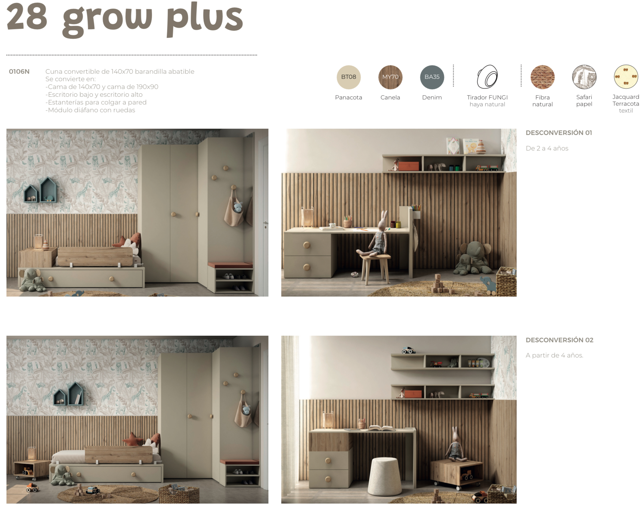 La Composición 28 Grow Plus Ros es evolutiva, práctica y estética. Por lo tanto, resulta ideal para quienes buscan un dormitorio infantil completo que crece con el niño.