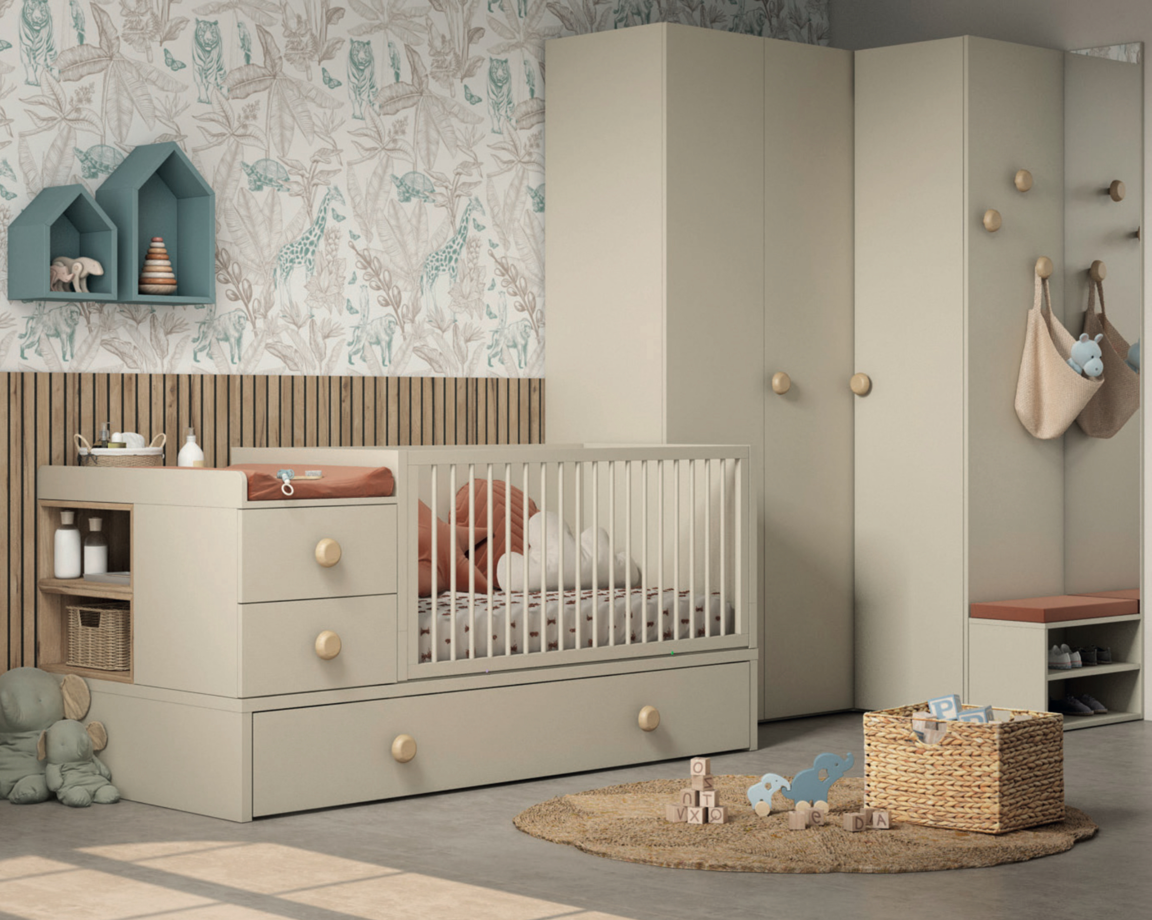 La Composición 28 Grow Plus Ros está pensada para acompañar al niño en cada etapa de su crecimiento. Sus acabados en panacota, canela y denim, junto con los tiradores Fungi en haya natural, ofrecen un diseño elegante, funcional y de gran personalidad. Además, cada módulo de esta composición aporta soluciones prácticas para el día a día.
