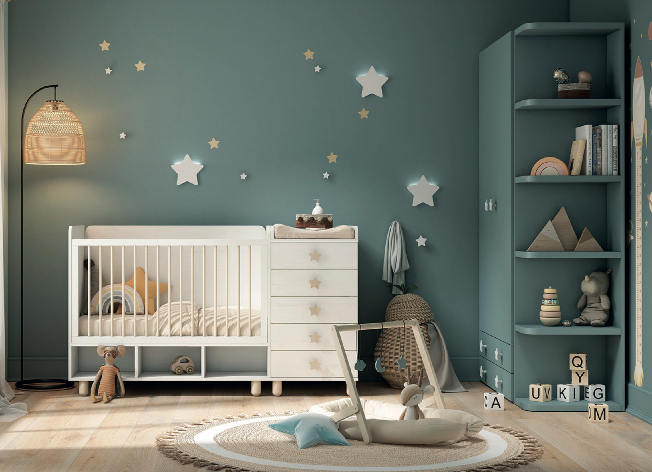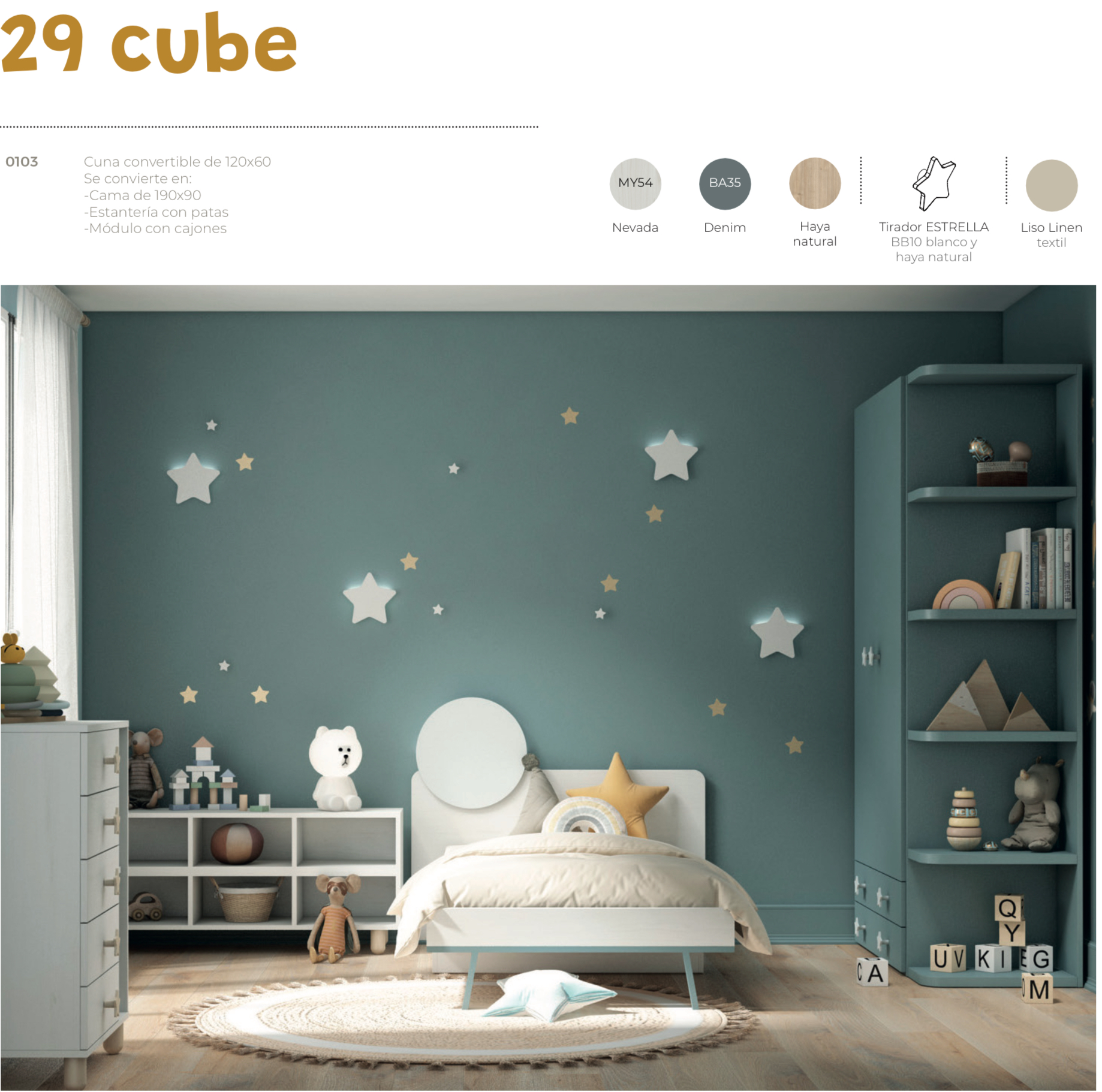 La Composición 29 Ros Cube es una solución evolutiva que combina diseño, funcionalidad y estilo para acompañar al niño desde sus primeros meses hasta su crecimiento. Sus acabados en colores nevada, denim y haya natural, junto con los tiradores estrella en blanco y haya, crean un ambiente alegre y equilibrado. Además, cada módulo está diseñado para ofrecer organización y comodidad en el día a día.