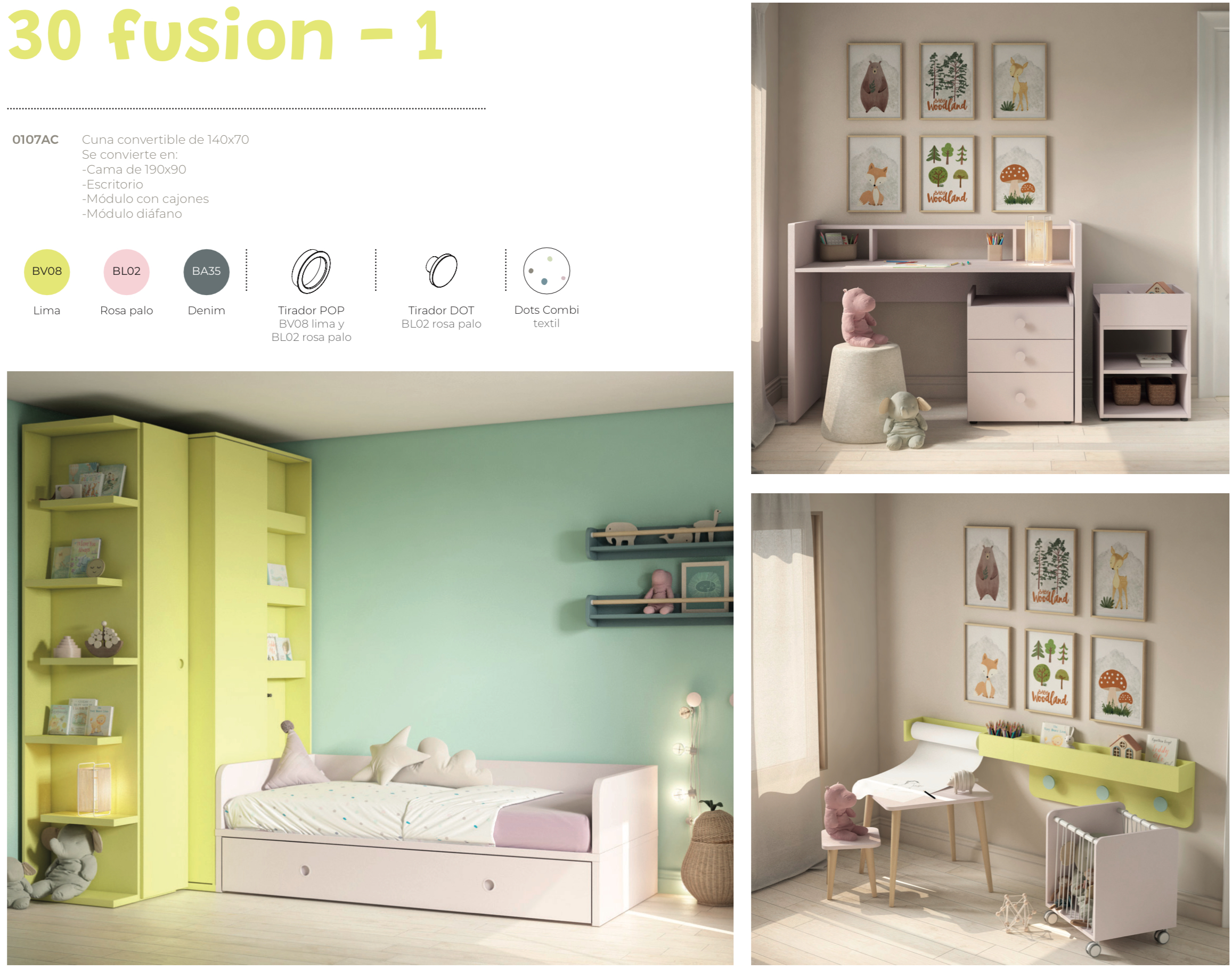 La Composición 30 Ros Fusión 1 ha sido diseñada para evolucionar con el crecimiento del niño, ofreciendo soluciones adaptadas a cada etapa. Sus acabados en lima, rosa palo y denim, combinados con los tiradores Pop y Dot, aportan frescura y originalidad al dormitorio infantil. Además, cada módulo incluido cumple una función esencial que hace de este conjunto una propuesta completa.
