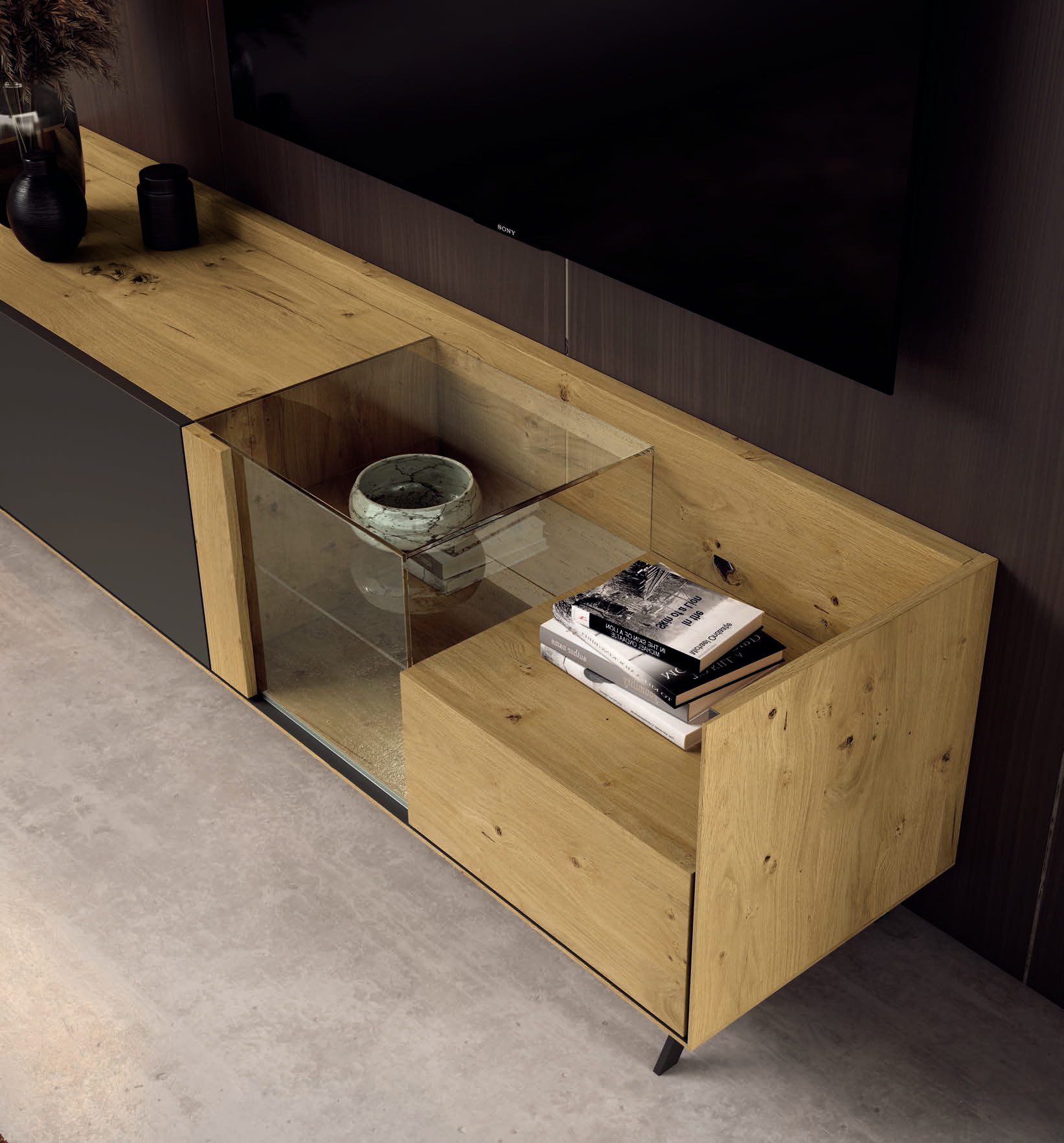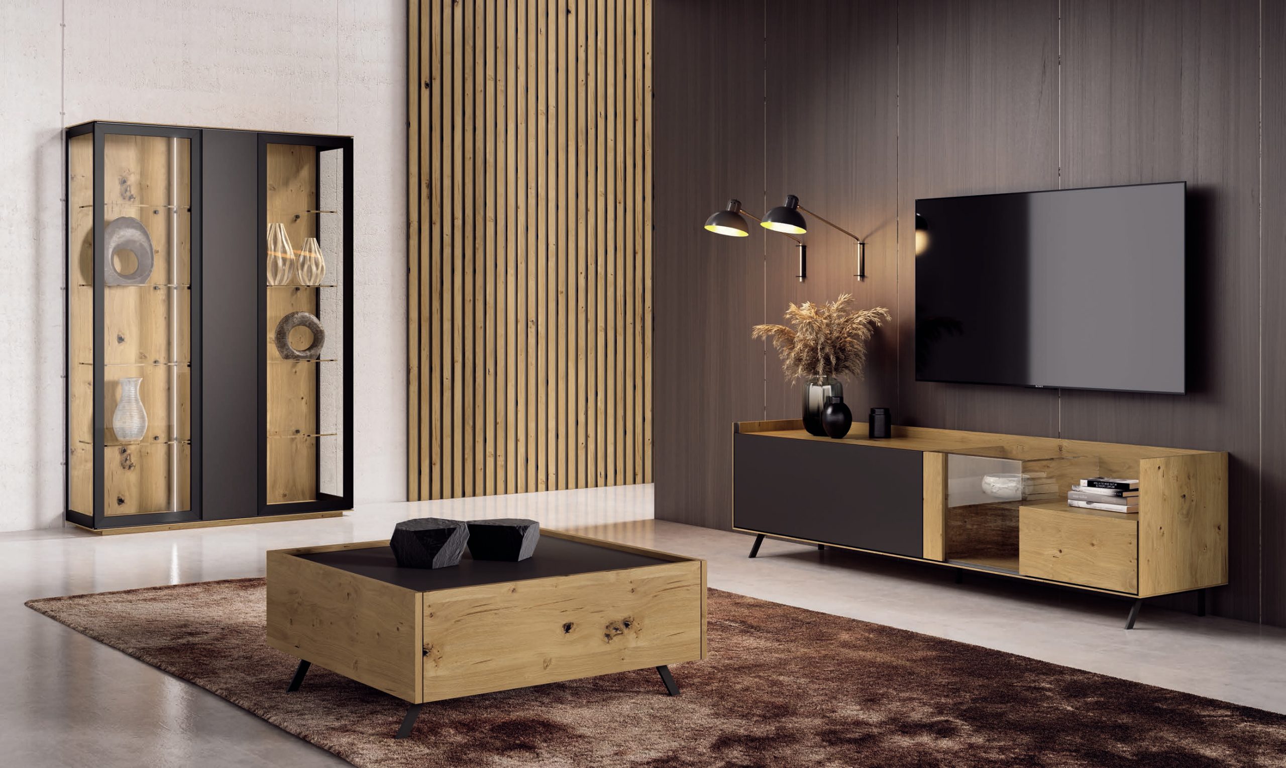 En resumen, el salón Loft Neo 27 ofrece diseño, funcionalidad y estilo. Su combinación de materiales, la vitrina de cristal y las patas altas crean un conjunto moderno, práctico y con mucha personalidad.