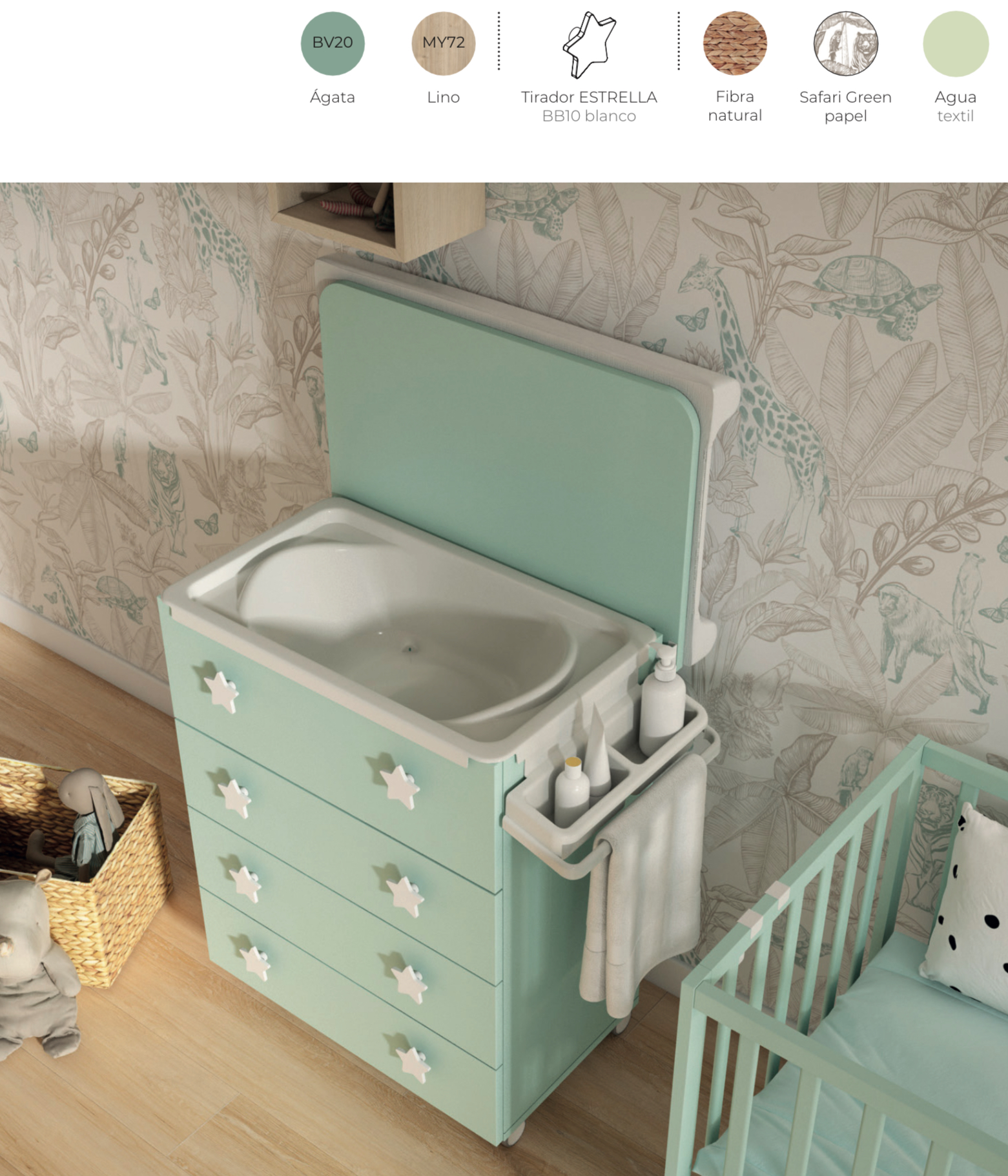 Otro valor diferencial son los accesorios de fibras naturales: una cesta, un cambiador y un moisés. Estos elementos transmiten calidez y refuerzan el carácter sostenible del programa Bamboo. Además, el papel pintado Moon aporta personalidad y convierte la habitación en un entorno único y acogedor.