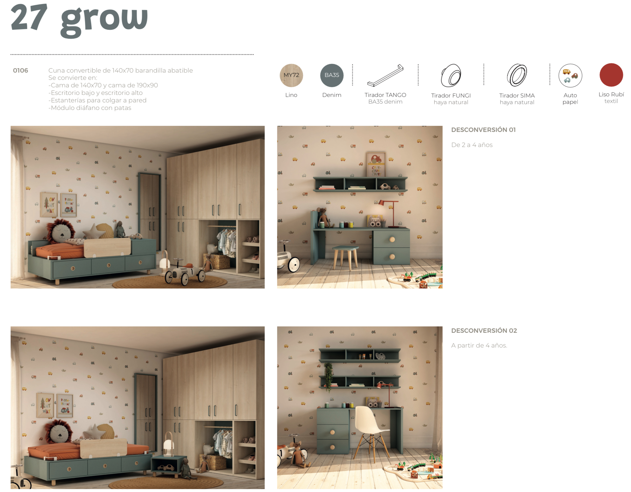 La Cuna Convertible 27 Grow es una solución práctica y evolutiva pensada para acompañar al niño desde sus primeros meses hasta su etapa juvenil. Sus acabados en lino y denim, junto con la combinación de tiradores Fungi, Sima y Tango, crean un estilo moderno y versátil. Además, este diseño ofrece la posibilidad de transformar la cuna en una cama compacta con escritorio, adaptándose a las distintas etapas de crecimiento.
