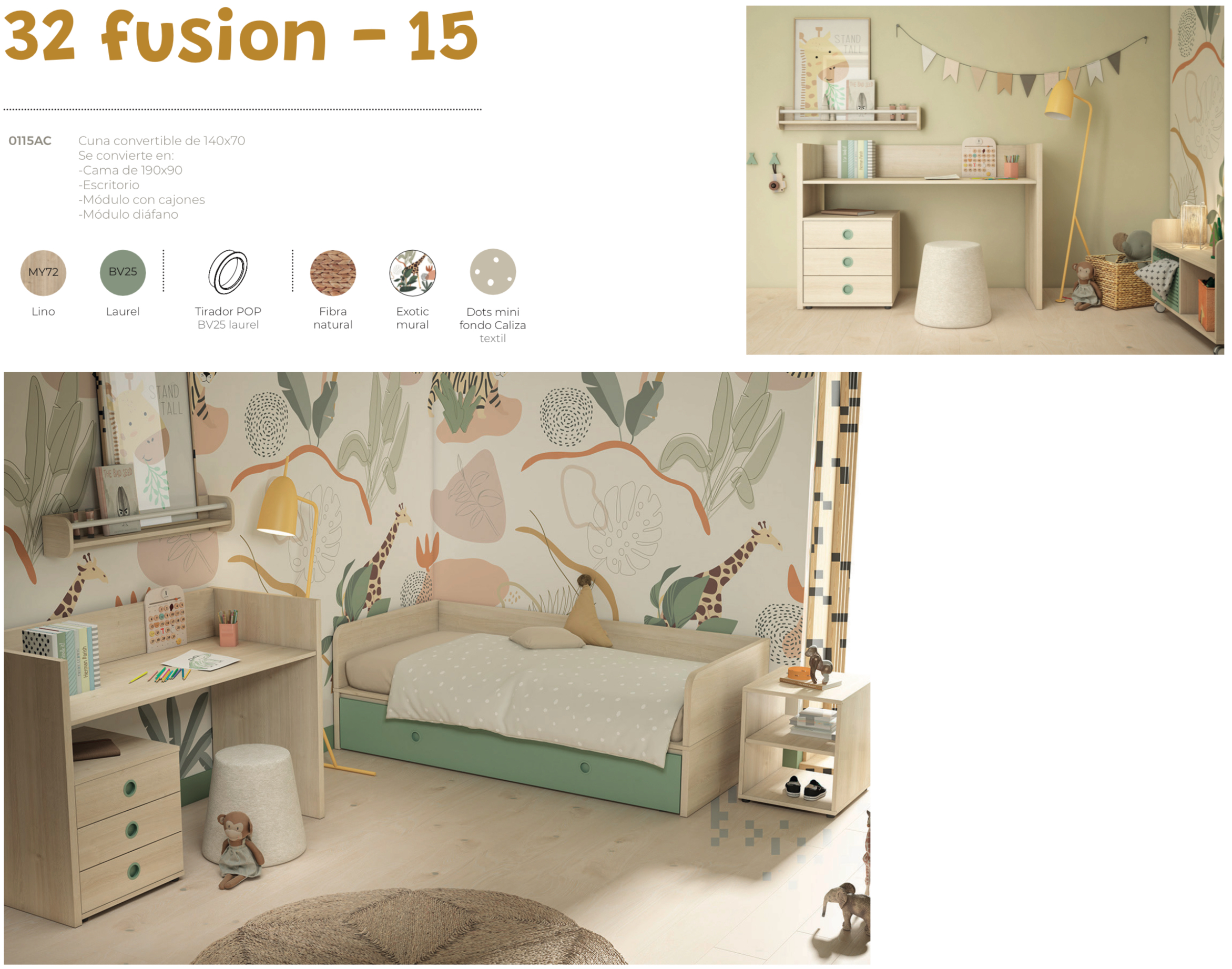 El mueble principal es el Convertible Fusión-15 con tapa de arrastre, que funciona primero como cuna y más adelante como cama juvenil con escritorio. Por eso, es una opción evolutiva que garantiza una inversión a largo plazo, adaptándose a las distintas etapas del niño.