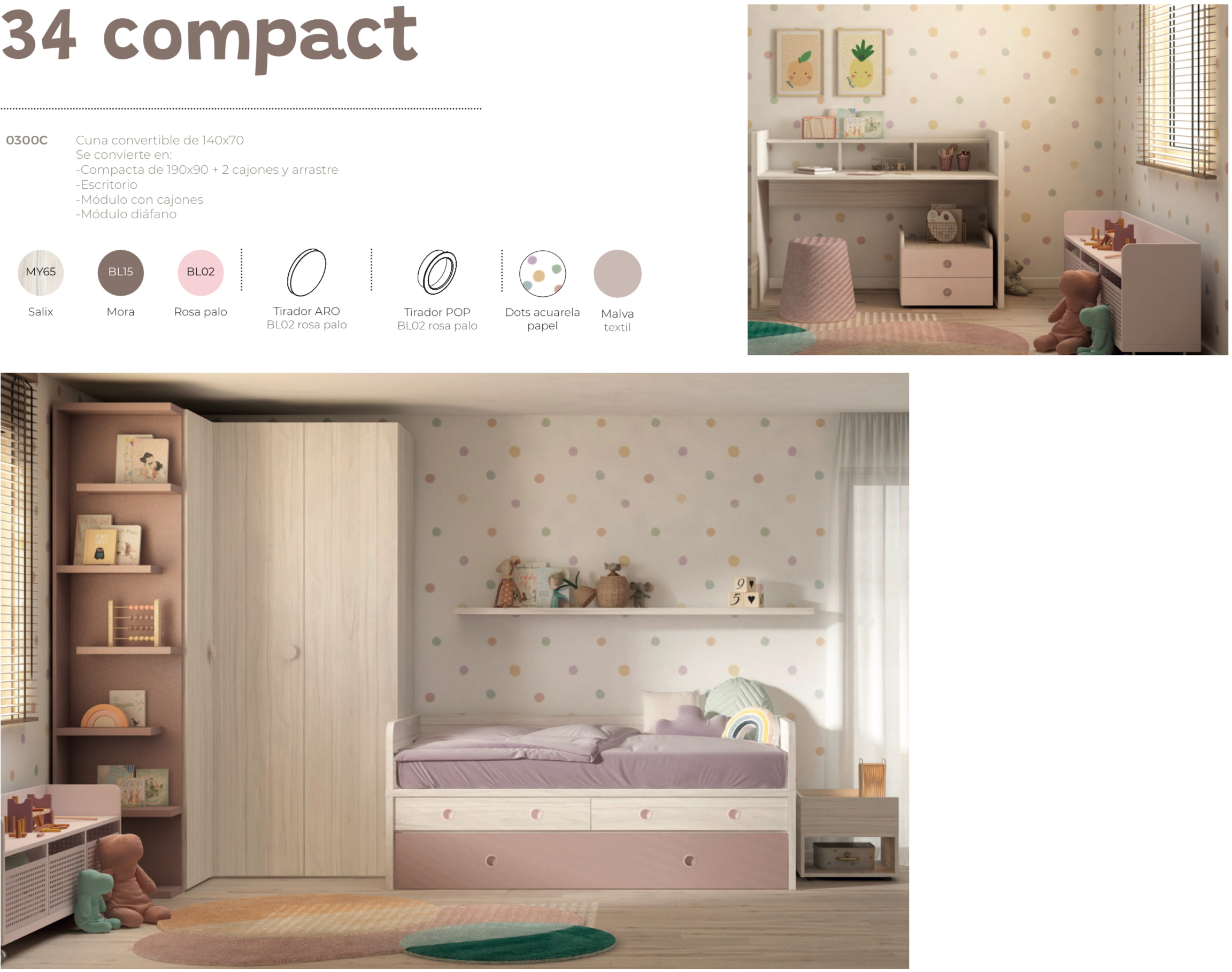 La Cuna Convertible 34 Compact Ros está diseñada para ofrecer practicidad, estilo y evolución en el dormitorio infantil. Sus acabados en salix, mora y rosa palo crean una combinación moderna y acogedora que aporta frescura al ambiente. Además, cada módulo de esta composición cumple una función esencial, garantizando organización y confort en el día a día.