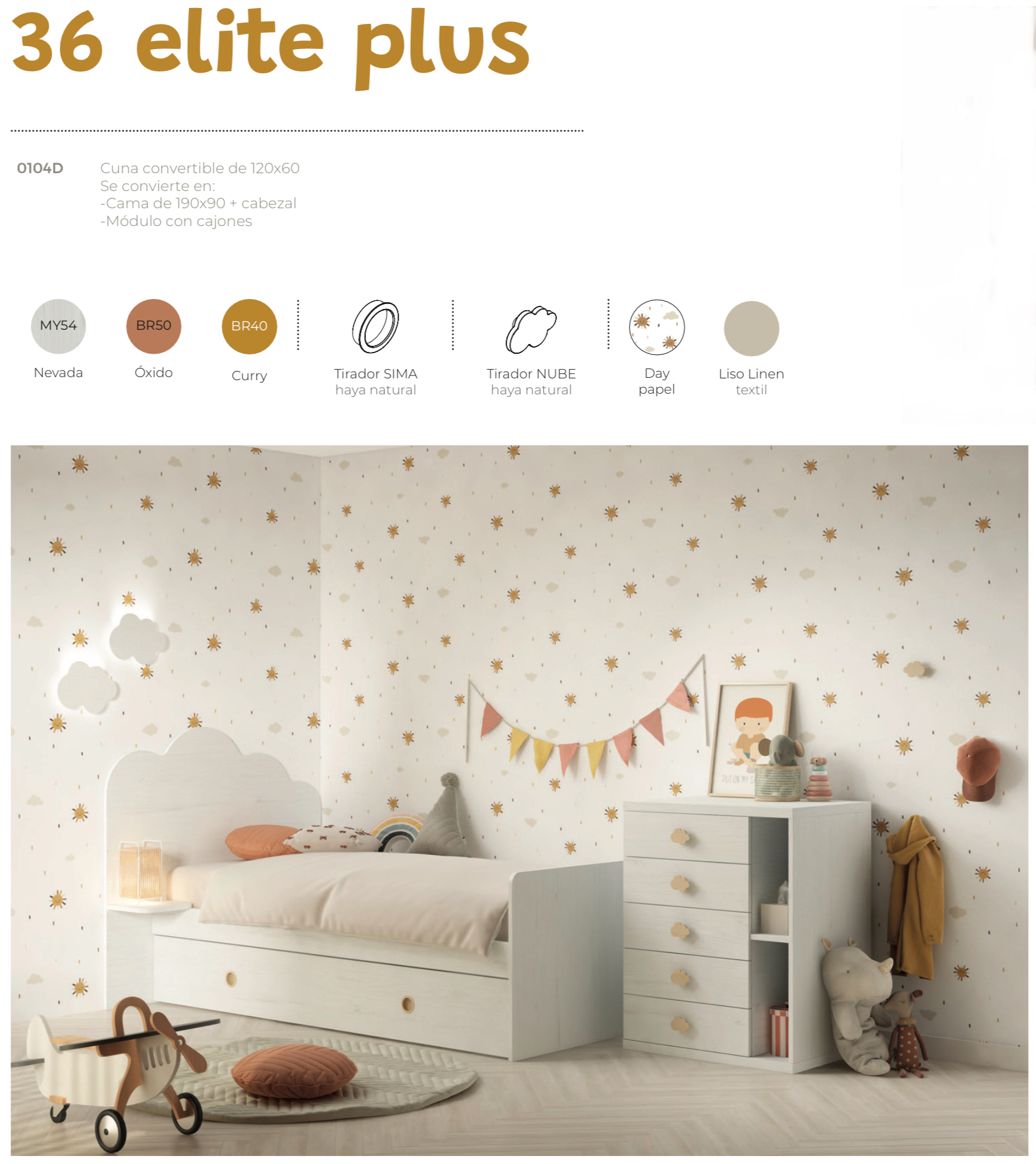 La Cuna Convertible 36 Elite Plus Ros está pensada para acompañar al niño en todas sus etapas, desde sus primeros meses hasta su crecimiento. Su acabado en colores nevada, óxido y curry, junto con tiradores Sima y Nube, crea un ambiente moderno y alegre. Además, combina funcionalidad, diseño y elementos lúdicos que transforman el dormitorio en un espacio único.