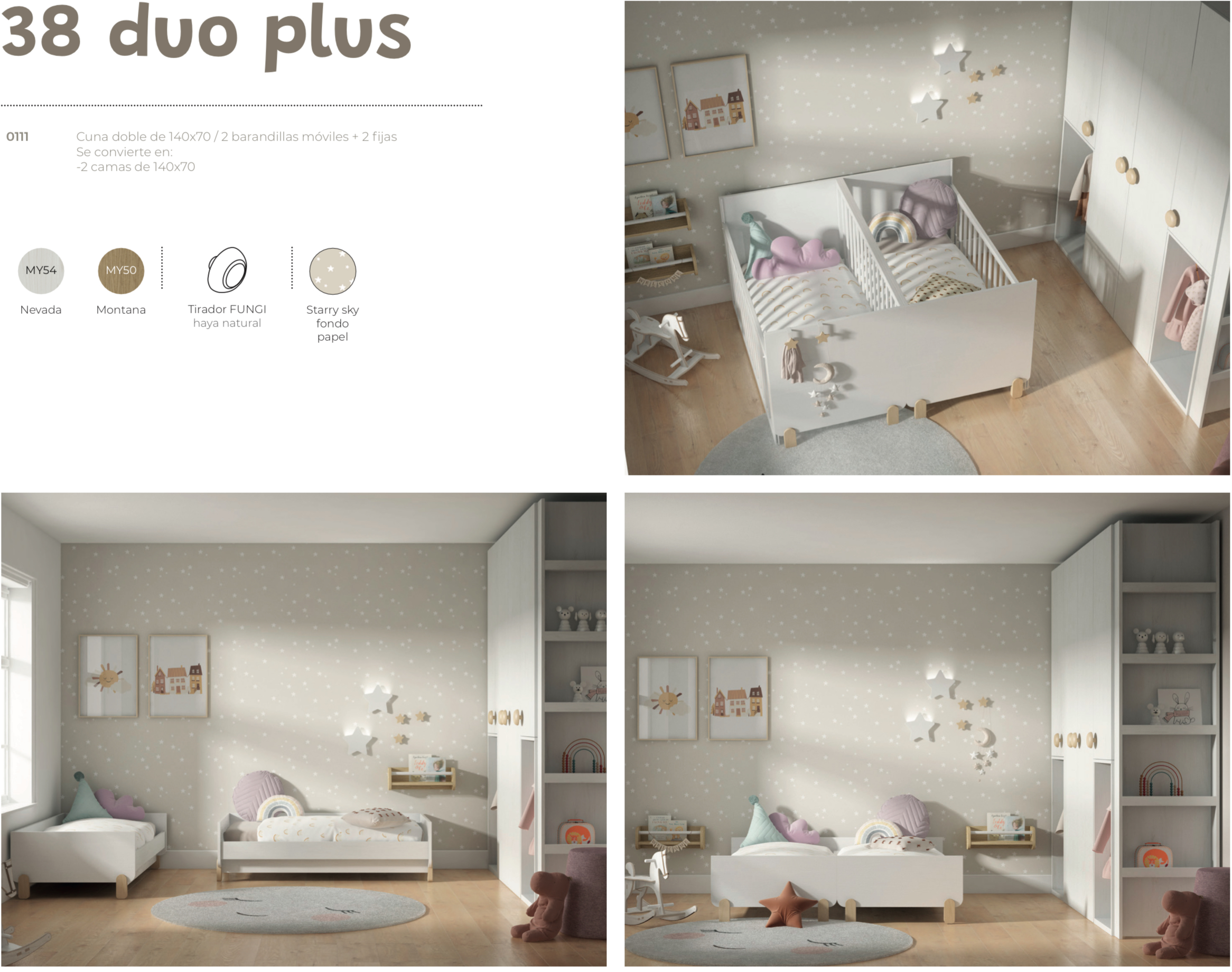 La Cuna Convertible 38 Duo Plus Ros está pensada para crecer junto al niño, ofreciendo funcionalidad, diseño y confort en un mismo dormitorio. Sus acabados en color nevada y montana, con tiradores Fungi en haya natural, crean un estilo elegante y acogedor. Además, cada pieza incluida ha sido cuidadosamente seleccionada para aportar comodidad y organización al espacio infantil.