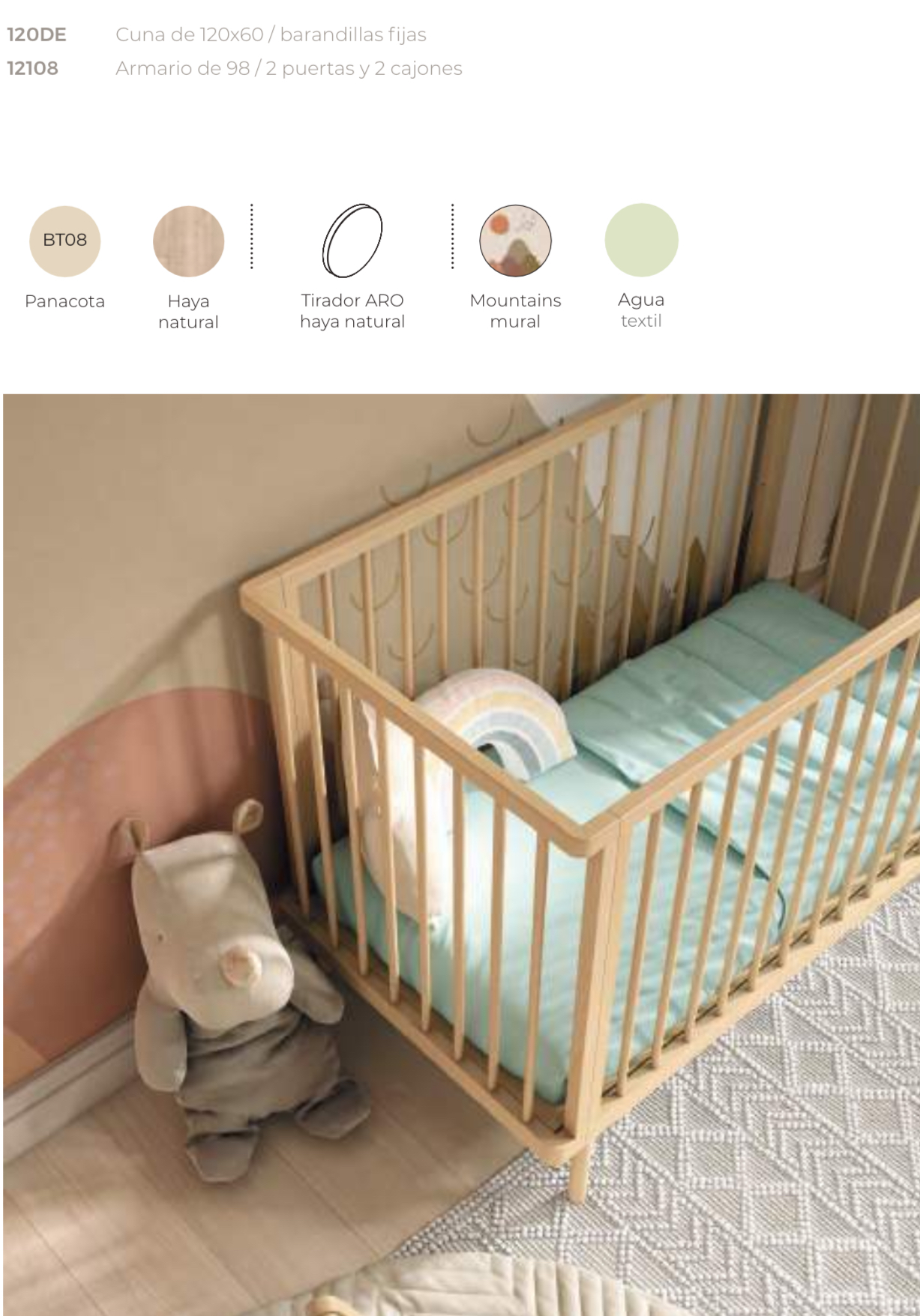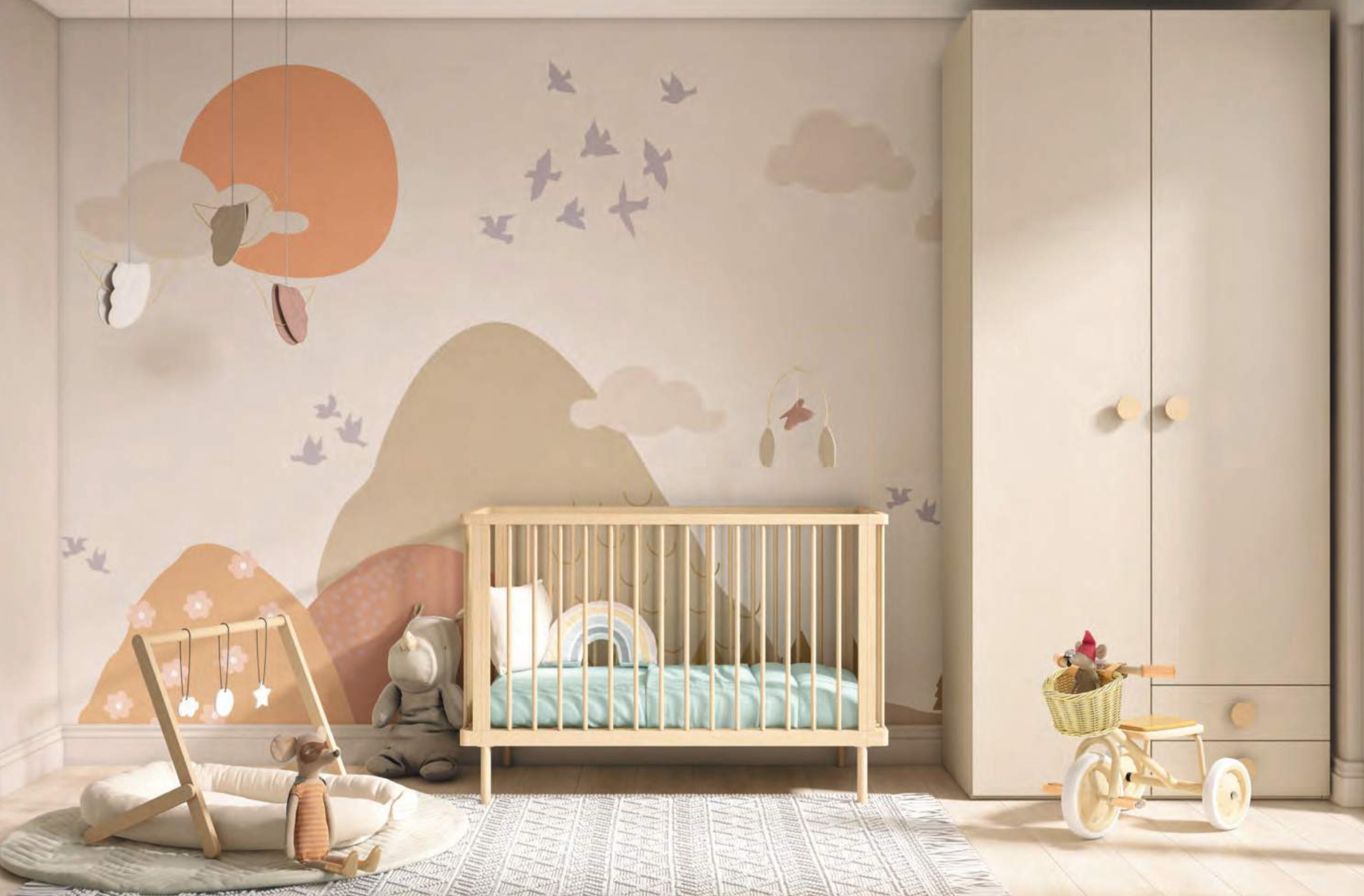 La composición se completa con un armario de 2 puertas y 2 cajones de 98 cm de ancho, ideal para guardar la ropa y accesorios del bebé con orden y estilo. De este modo, se logra un conjunto práctico que combina descanso, almacenamiento y decoración en un mismo espacio.