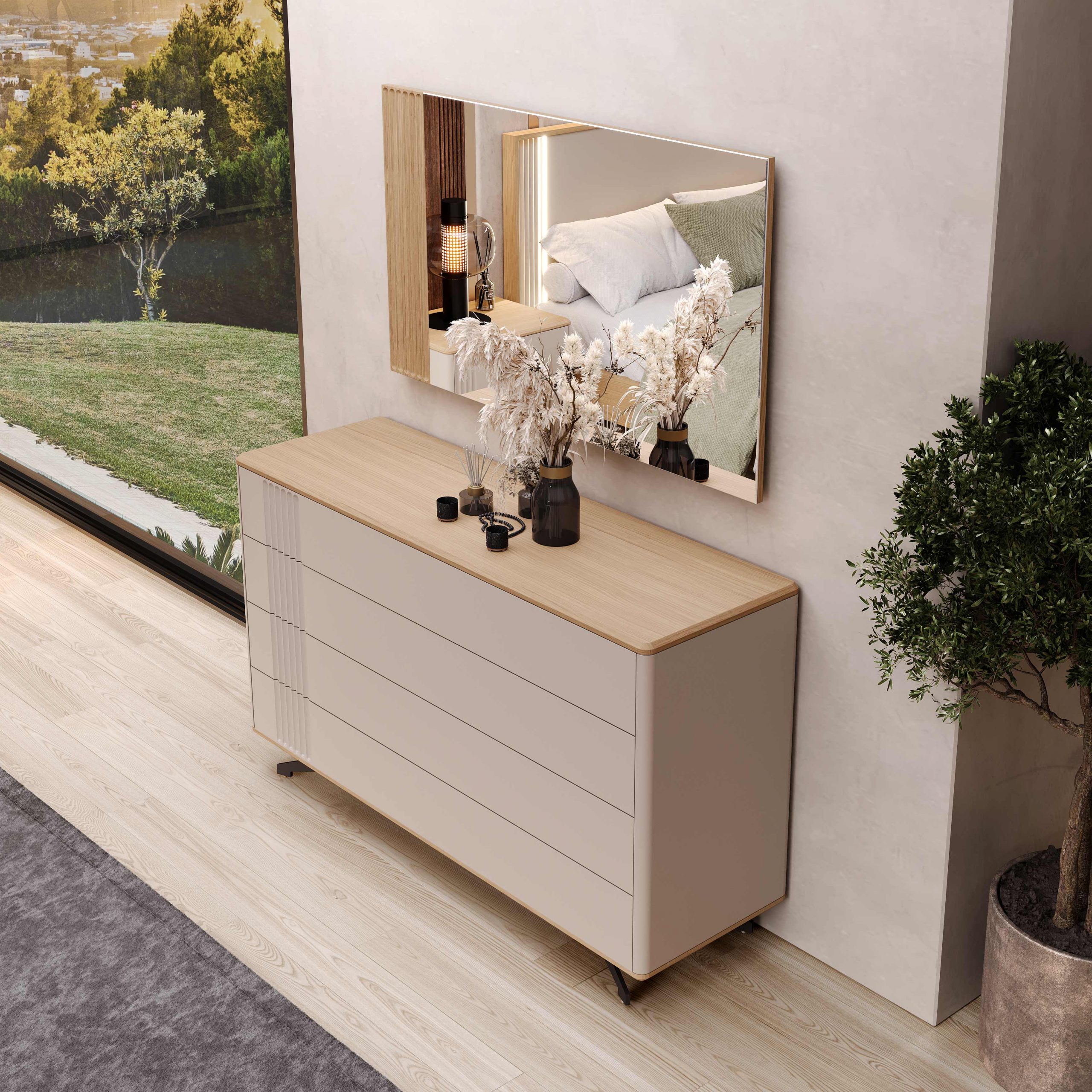 Por un lado, los costados y encimeras en chapa natural aportan calidez, textura y una sensación acogedora al espacio. Este material resalta las vetas de la madera y garantiza durabilidad, resistencia y un mantenimiento sencillo. Gracias a su tono natural, el dormitorio transmite serenidad y elegancia, adaptándose fácilmente a distintos estilos decorativos.
