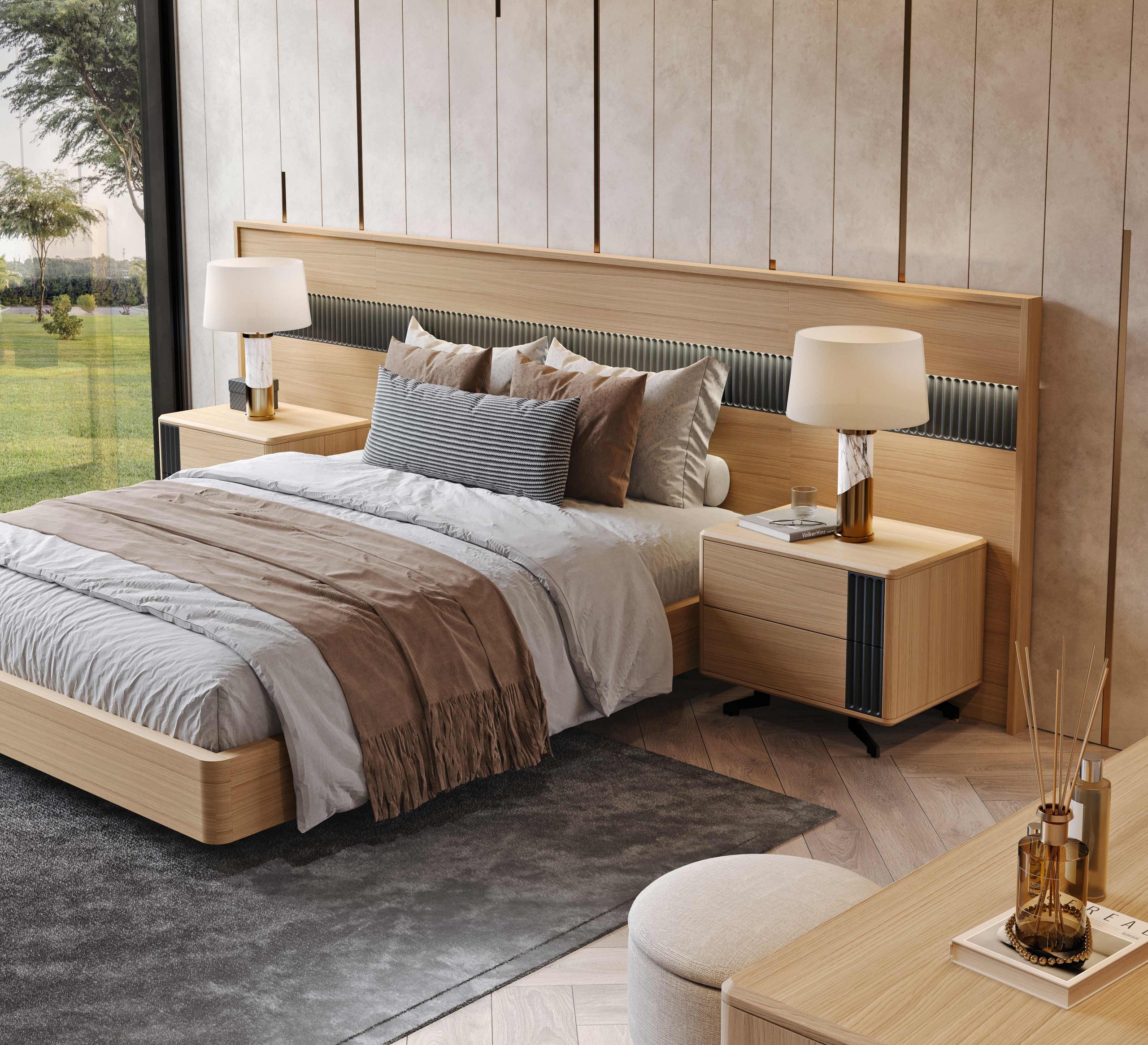 Por otro lado, los frentes en madera maciza permiten realizar el fresado decorativo que simula la palillería, un detalle característico del programa Pereira. Este acabado artesanal añade profundidad visual y un toque sofisticado a las mesillas y al cabecero, en este caso del cabecero lo convine con la luz perfectamente colocada para realzar el calado convirtiendo al conjunto en una pieza única.