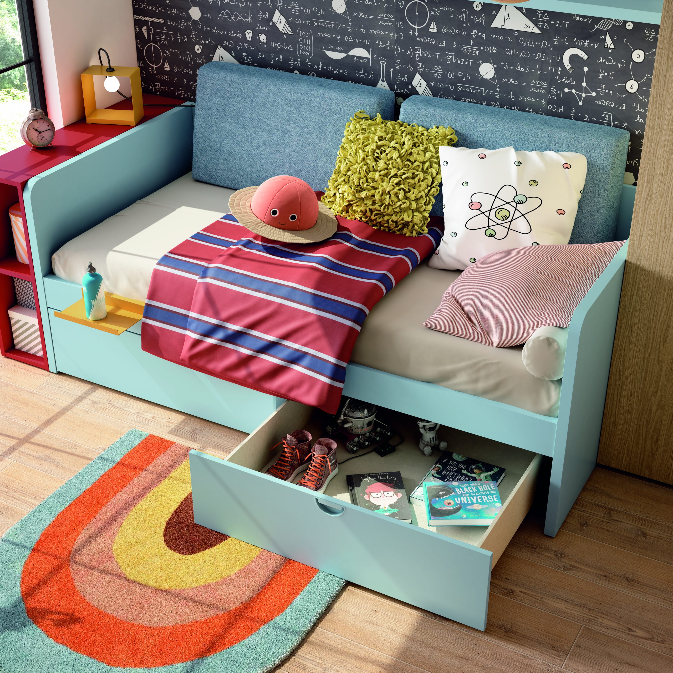 El dormitorio incluye una cama de 90 cm con arcón en cabezal abatible y estante interior, perfecta para aprovechar el espacio de almacenamiento. Se acompaña de un nido con dos cajones con ruedas (190×90 cm), ideal para invitados o como zona auxiliar. De este modo, la habitación ofrece un descanso versátil y funcional.