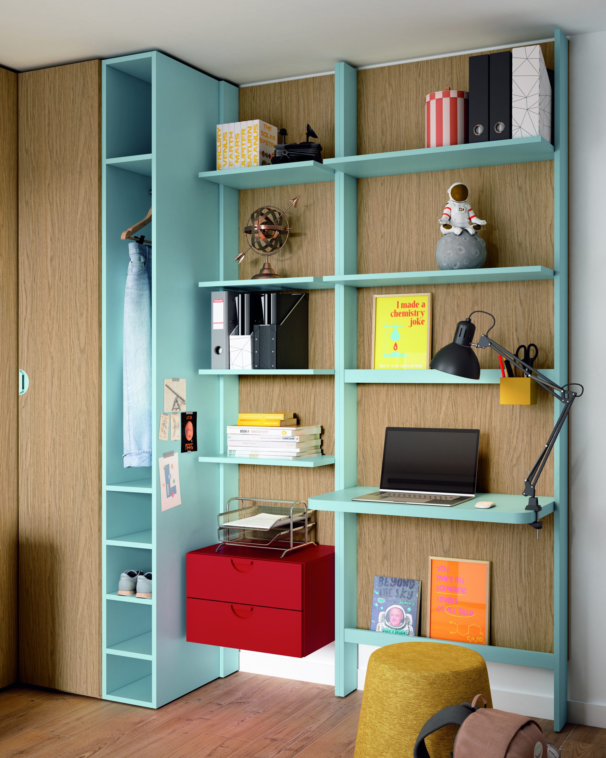 La composición integra una estantería con escritorio, que crea un espacio cómodo y práctico para el estudio. Así, se garantiza un ambiente juvenil completo que une descanso, orden y productividad.