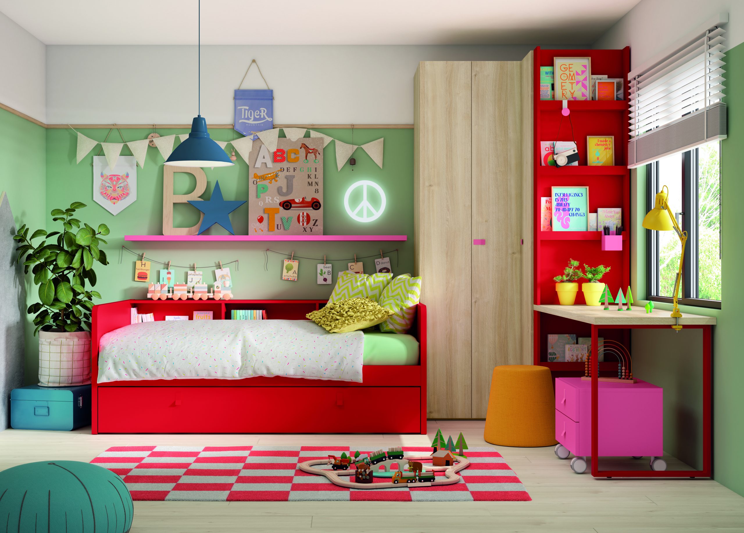 El Dormitorio Juvenil Ros DELULU 04 destaca por su diseño en colores lino, rojo y azalea, con tiradores Soul en azalea que aportan un estilo fresco, alegre y actual. Además, esta composición ha sido creada para combinar descanso, almacenaje y estudio en un único espacio bien organizado.