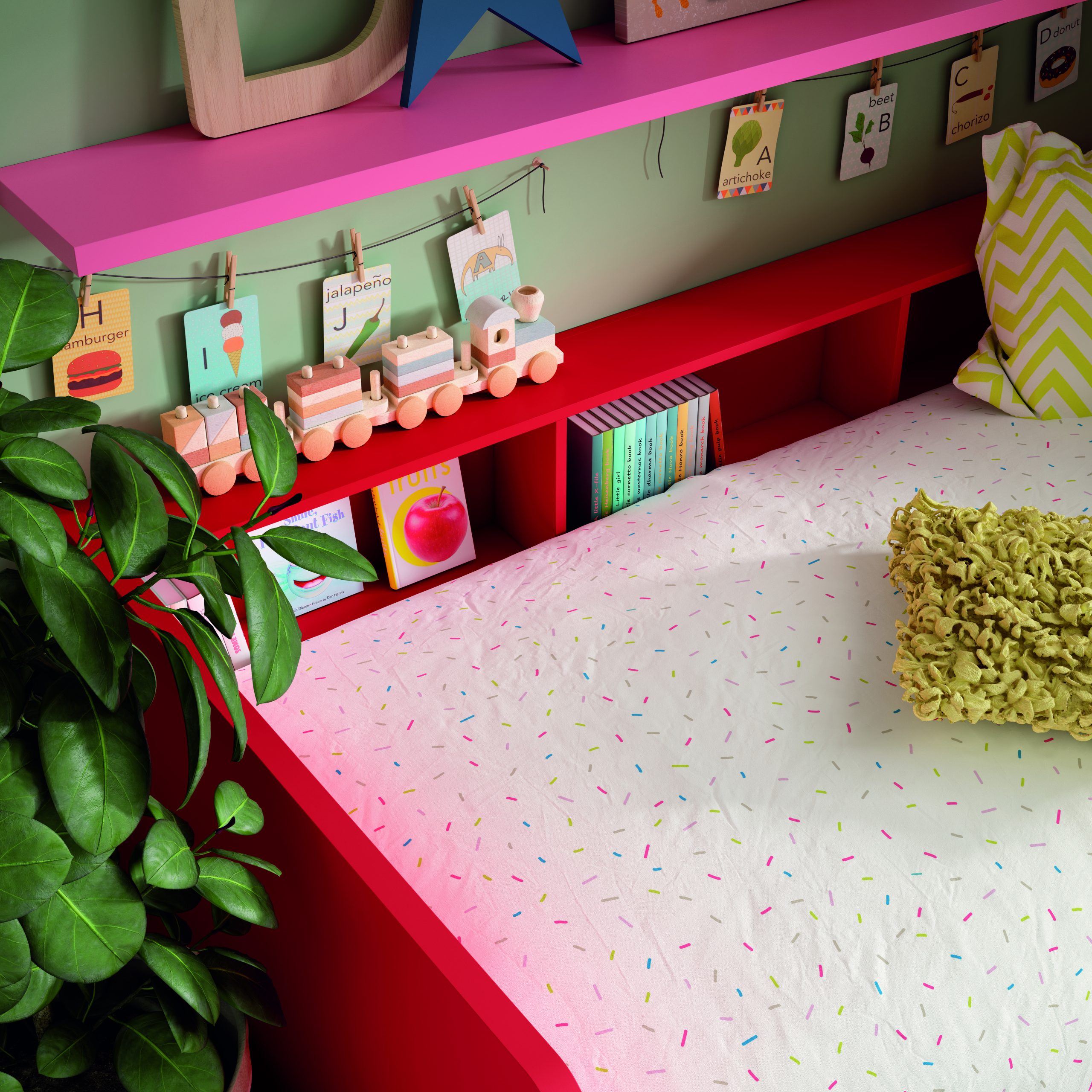 La composición incluye una cama nido con estantería y tapa de arrastre (190×90 cm), que ofrece dos camas en el mismo espacio. Por lo tanto, es una opción perfecta para habitaciones compartidas o para disponer de una cama auxiliar.