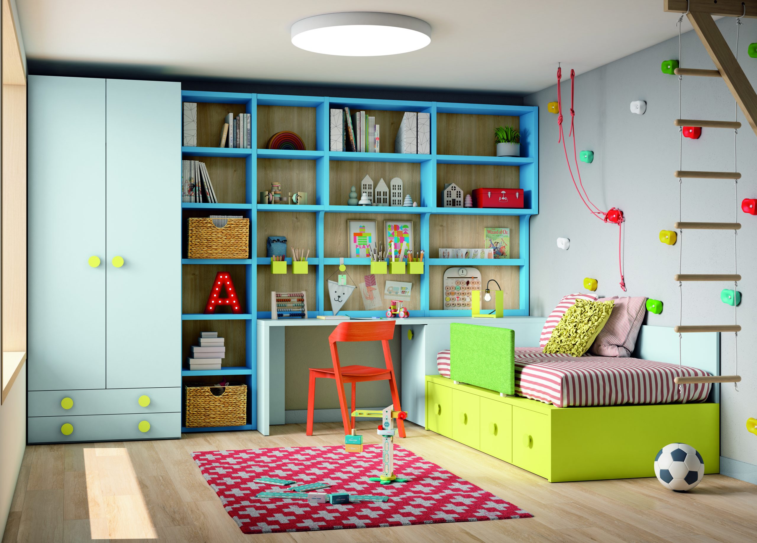 El Dormitorio Juvenil Ros DELULU 12 combina los colores lino, nube, cielo y lima con tiradores Aro en lima, logrando un diseño fresco y actual. Su composición está pensada para ofrecer soluciones completas de descanso, almacenaje y estudio en un mismo espacio.