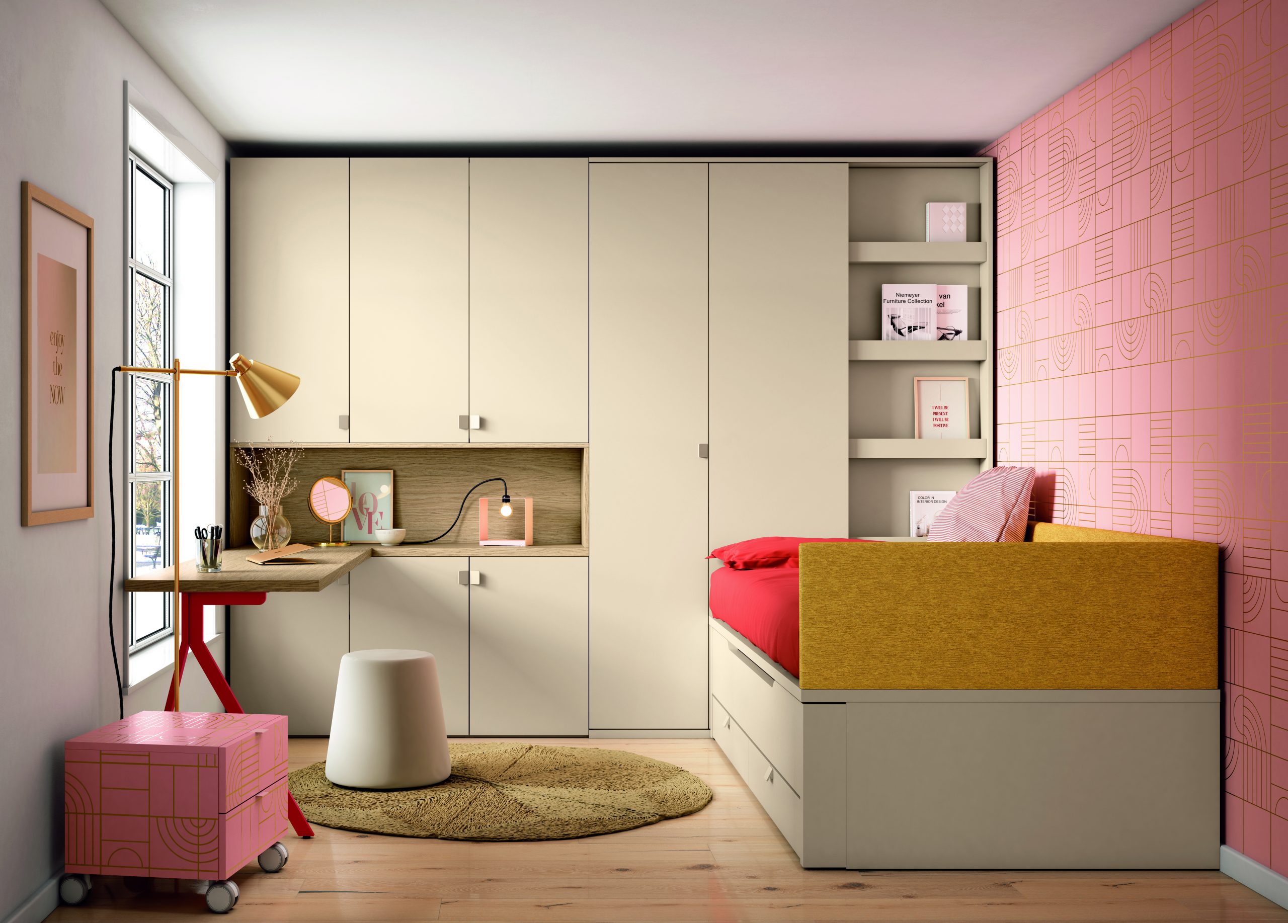 El dormitorio se completa con una mesita de dos cajones CRAZY PRINT, una lámpara metálica CUBIK (18x18x15 cm), un puff cónico liso en color linen y una alfombra redonda de fibras naturales (150 cm de diámetro). Estos complementos aportan un toque de estilo y confort adicional al ambiente juvenil.