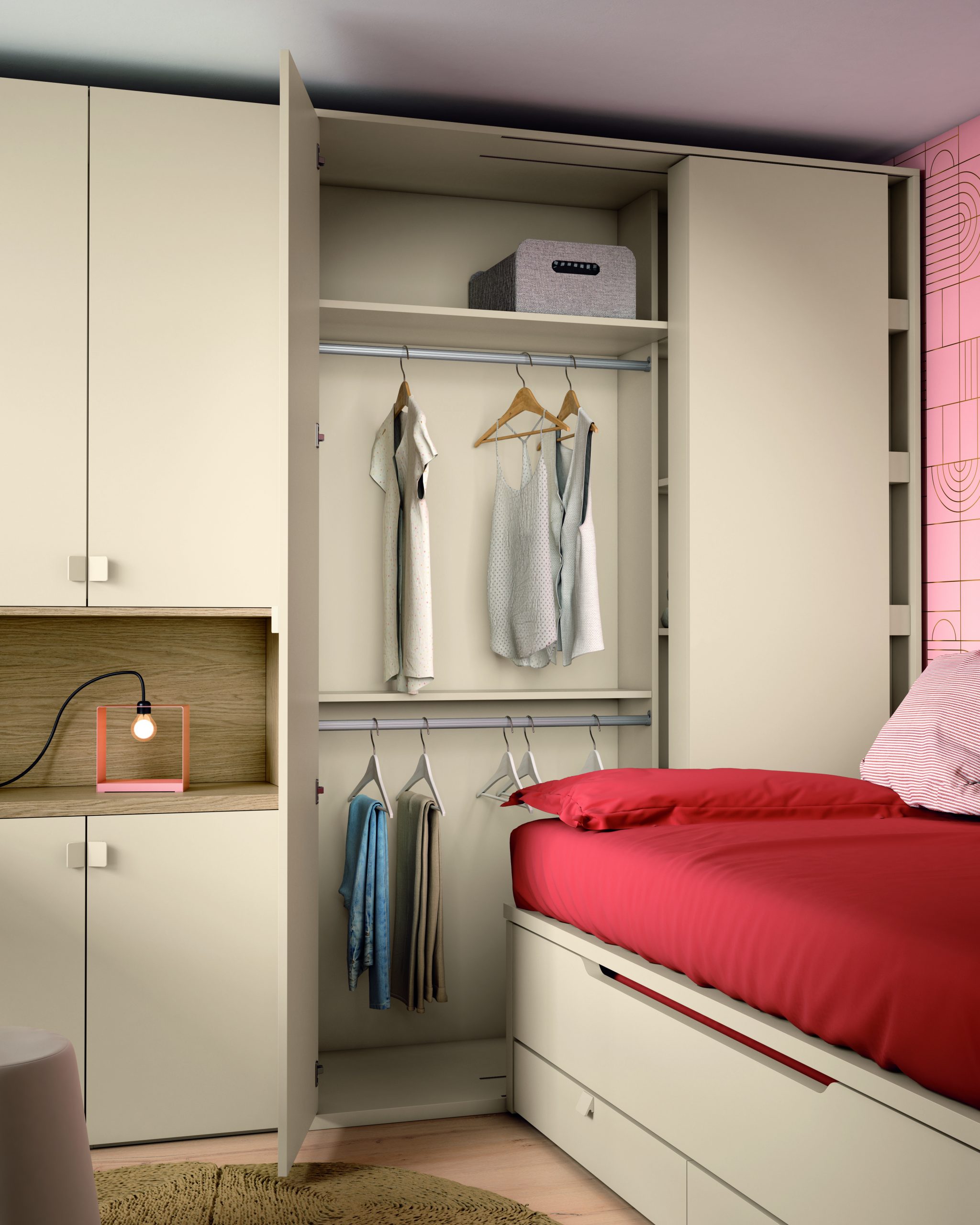 La habitación incorpora una compacta superior de 190×105 cm con cama deslizable y cajonera de dos cajones de 16,4 cm, lo que permite tener una cama auxiliar siempre lista y espacio extra para guardar. De este modo, se aprovecha al máximo cada metro del dormitorio.