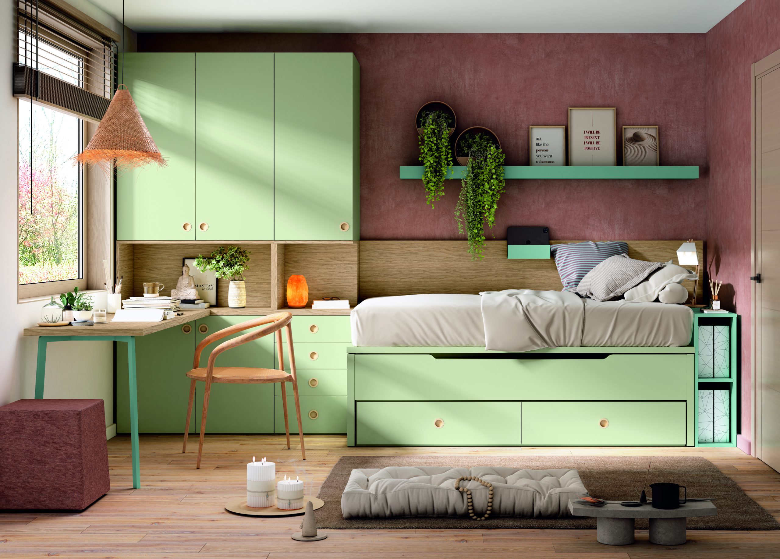 El Dormitorio Juvenil Ros DELULU 15 combina los tonos montana, agua y ágata, con tiradores Sima en haya natural. Esta paleta de colores crea un ambiente juvenil fresco y equilibrado, ideal para habitaciones modernas.