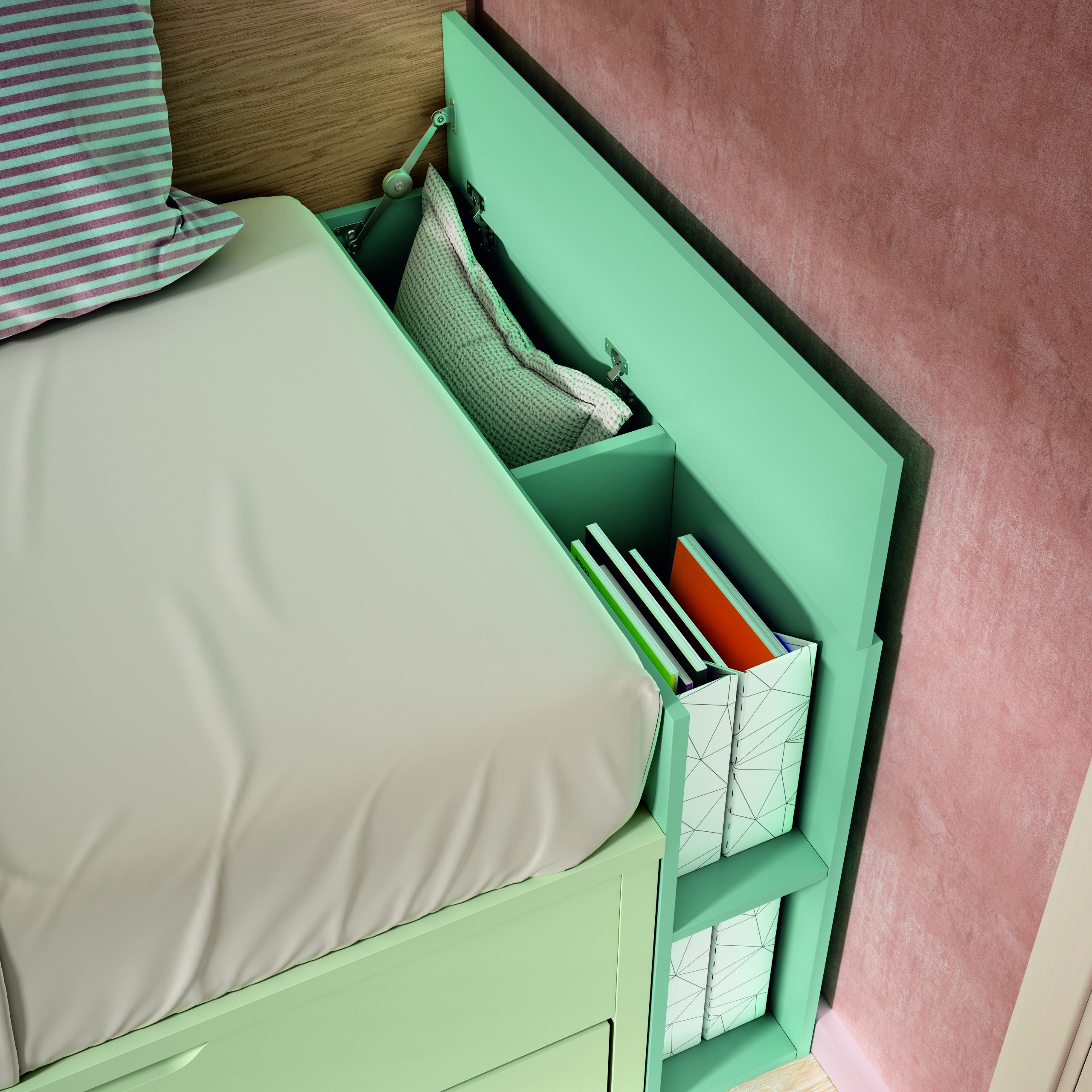 El conjunto incluye un arcón cabezal con tapa abatible y estante interior derecho (24,5×101 cm) para cama de 90 cm, que ofrece un lugar seguro y funcional para guardar ropa de cama o accesorios. Además, la DUO compacta superior (190×90 cm) con cama deslizable y cajonera de dos cajones de 24,7 cm garantiza comodidad y almacenamiento adicional. De este modo, se obtiene un espacio de descanso versátil.