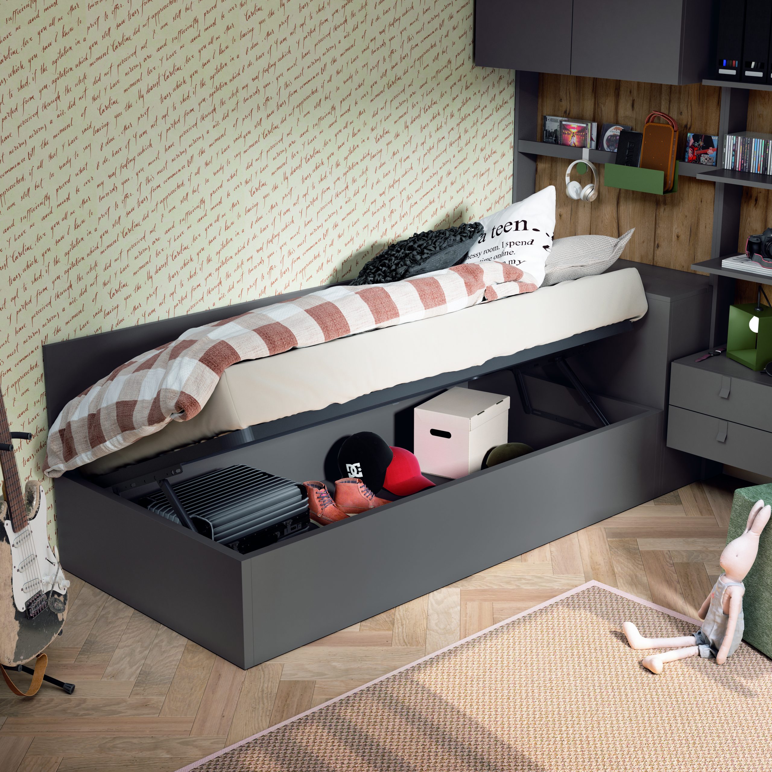El dormitorio incluye un canapé de apertura horizontal que ofrece gran capacidad de almacenaje, perfecto para mantener el espacio libre y organizado. Además, cuenta con una estantería con escritorio abatible, un armario en esquina con estantería integrada, y un arcón auxiliar que amplía las opciones de orden y funcionalidad.