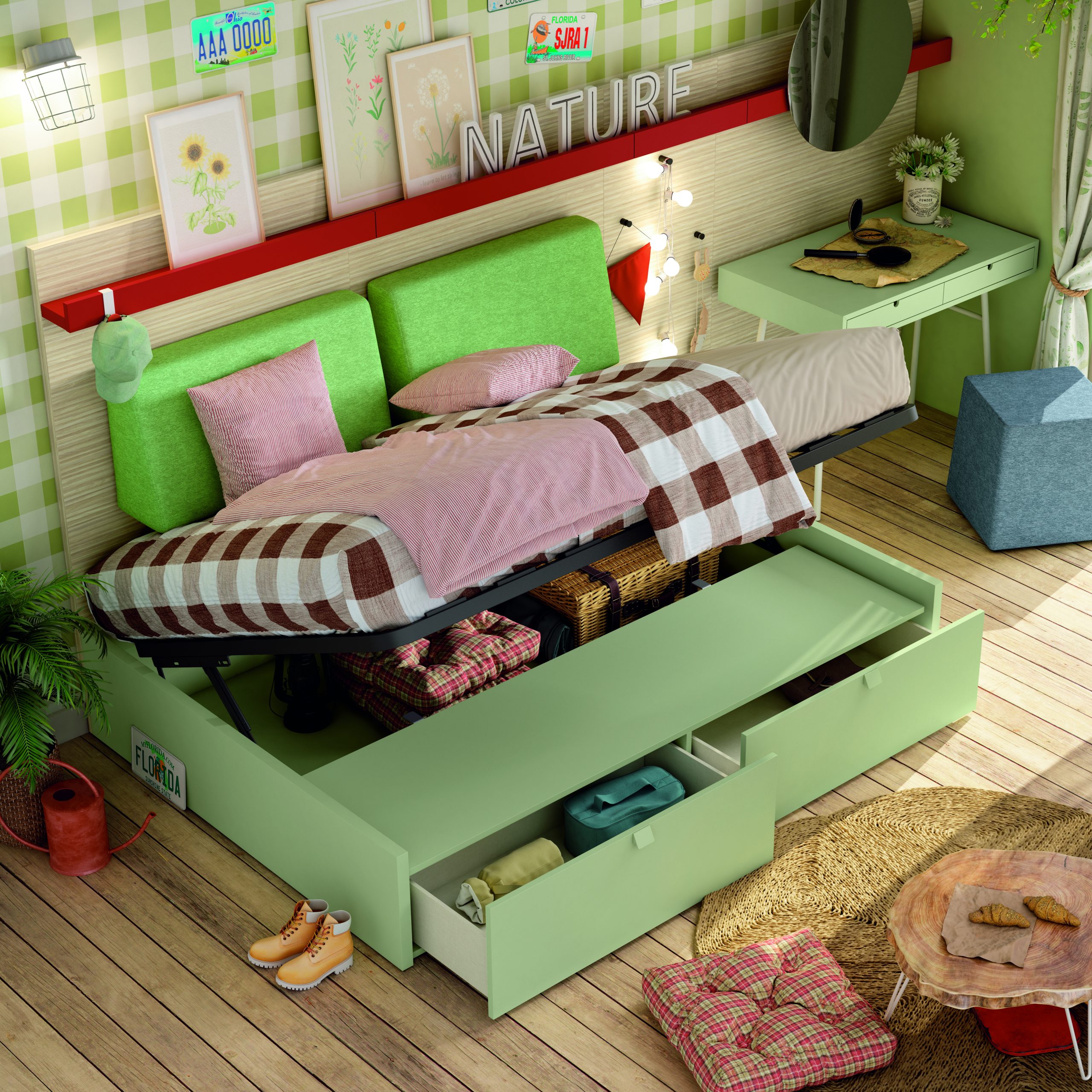 La composición incluye un canapé con cajones y apertura horizontal (190 x 135 cm), que ofrece un excelente espacio de almacenaje. Los cabezales con estante revistero y los colgadores integrados son ideales para mantener el orden y tenerlo todo al alcance de la mano.