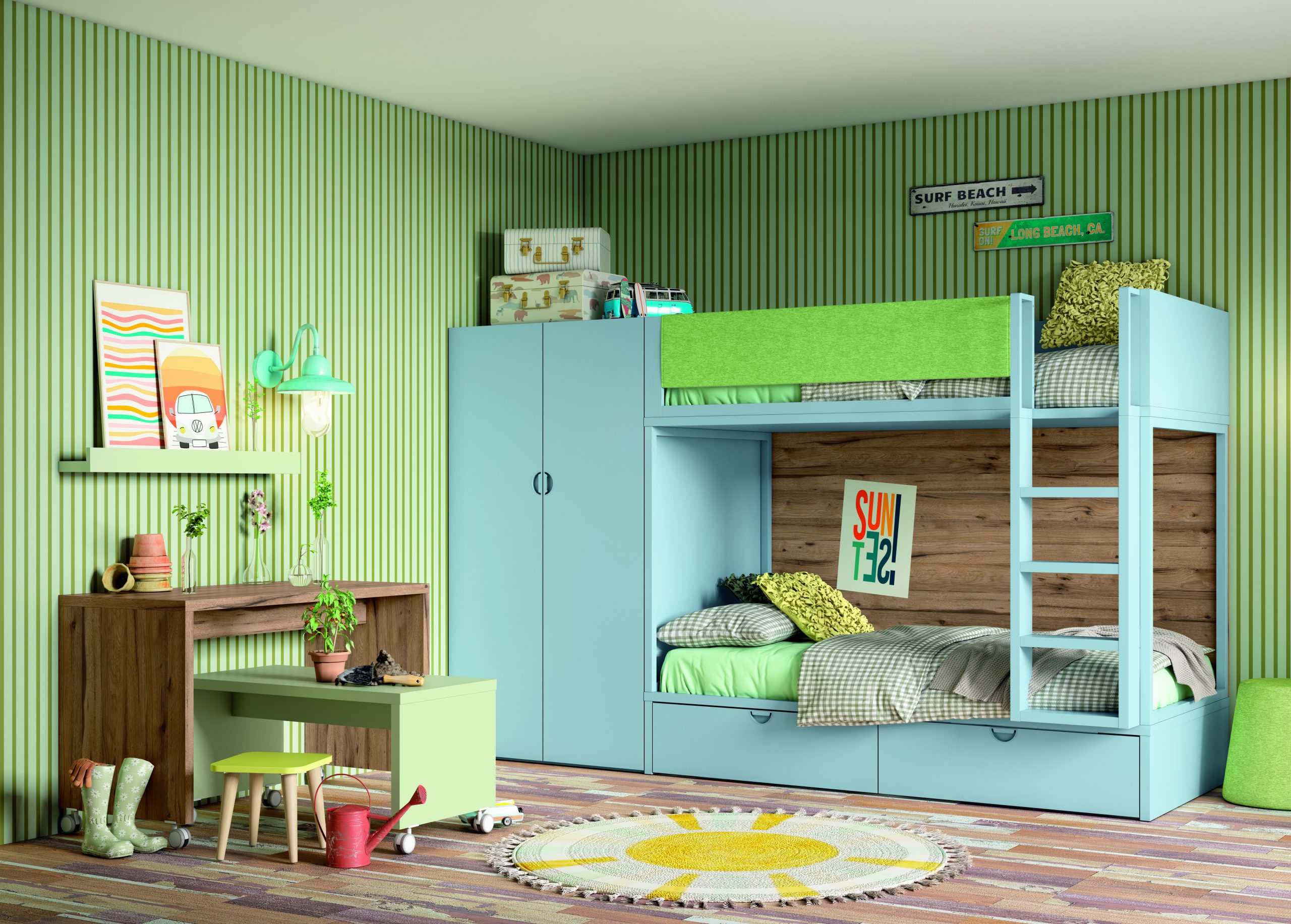 Por otra parte, esta composición destaca por su capacidad de optimizar cada metro del dormitorio. La litera con cama inferior y dos cajones nido con ruedas (190 x 90 + 190 x 90) ofrece una solución perfecta para familias que buscan espacio adicional sin renunciar al diseño. Gracias a su estructura robusta y a su quitamiedos tipo “X”, garantiza seguridad y comodidad.