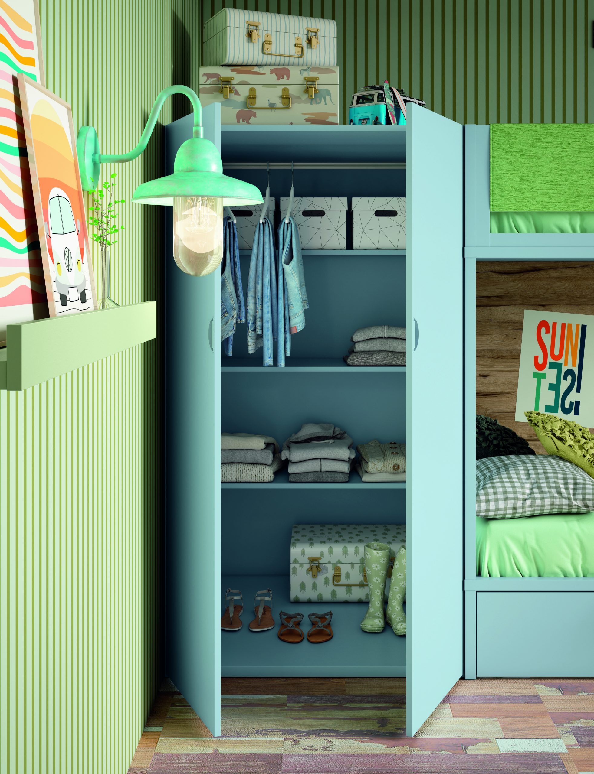 Además, incluye una mesa infantil con ruedas (98 x 49) y una mesa juvenil (117,6 x 58,2), ideales para adaptarse al crecimiento del niño. El estante revistero con soportes ocultos ayuda a mantener el orden y aporta ligereza visual, mientras que el armario de dos puertas (98 x 101,2) completa la composición ofreciendo capacidad y estilo.