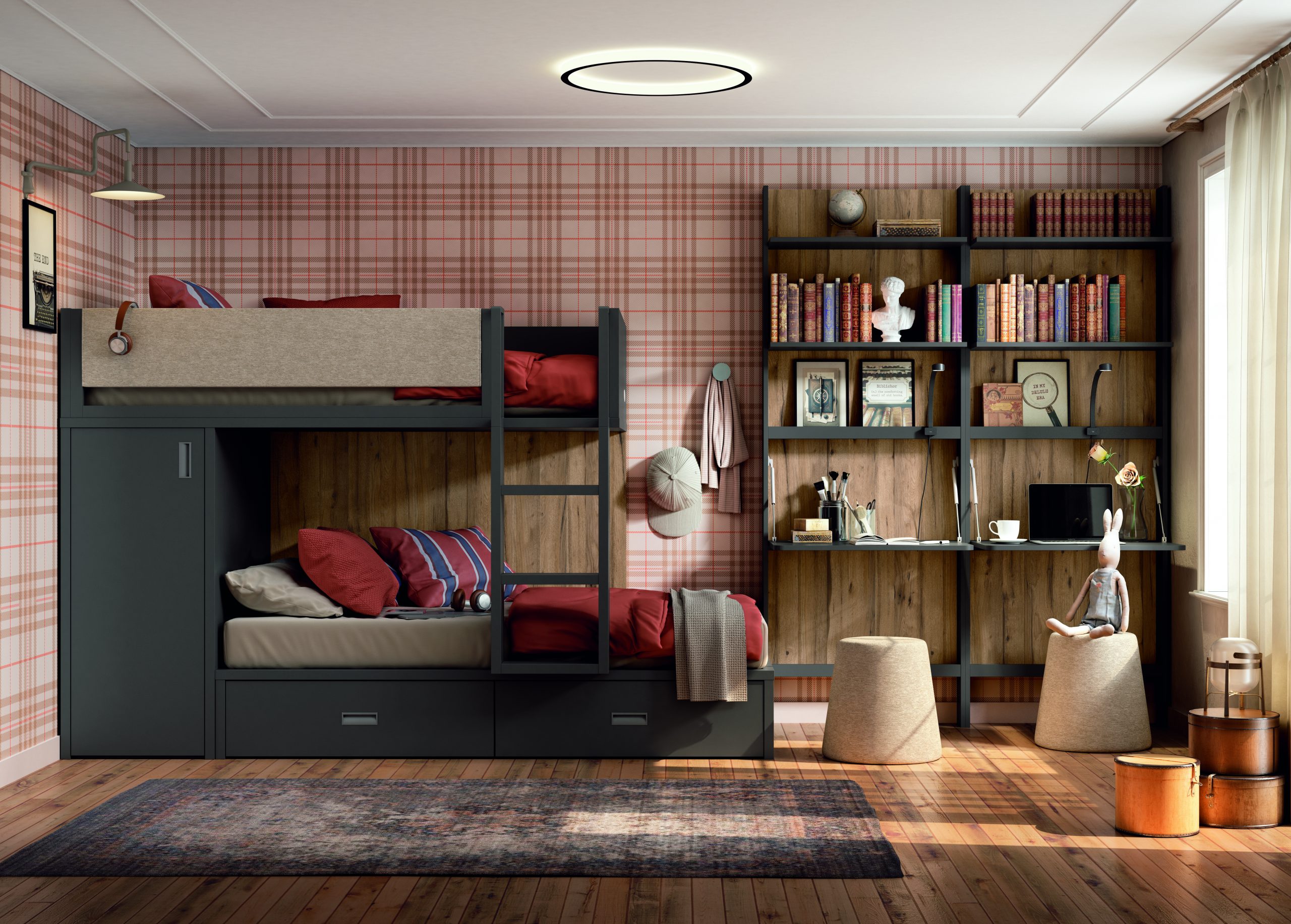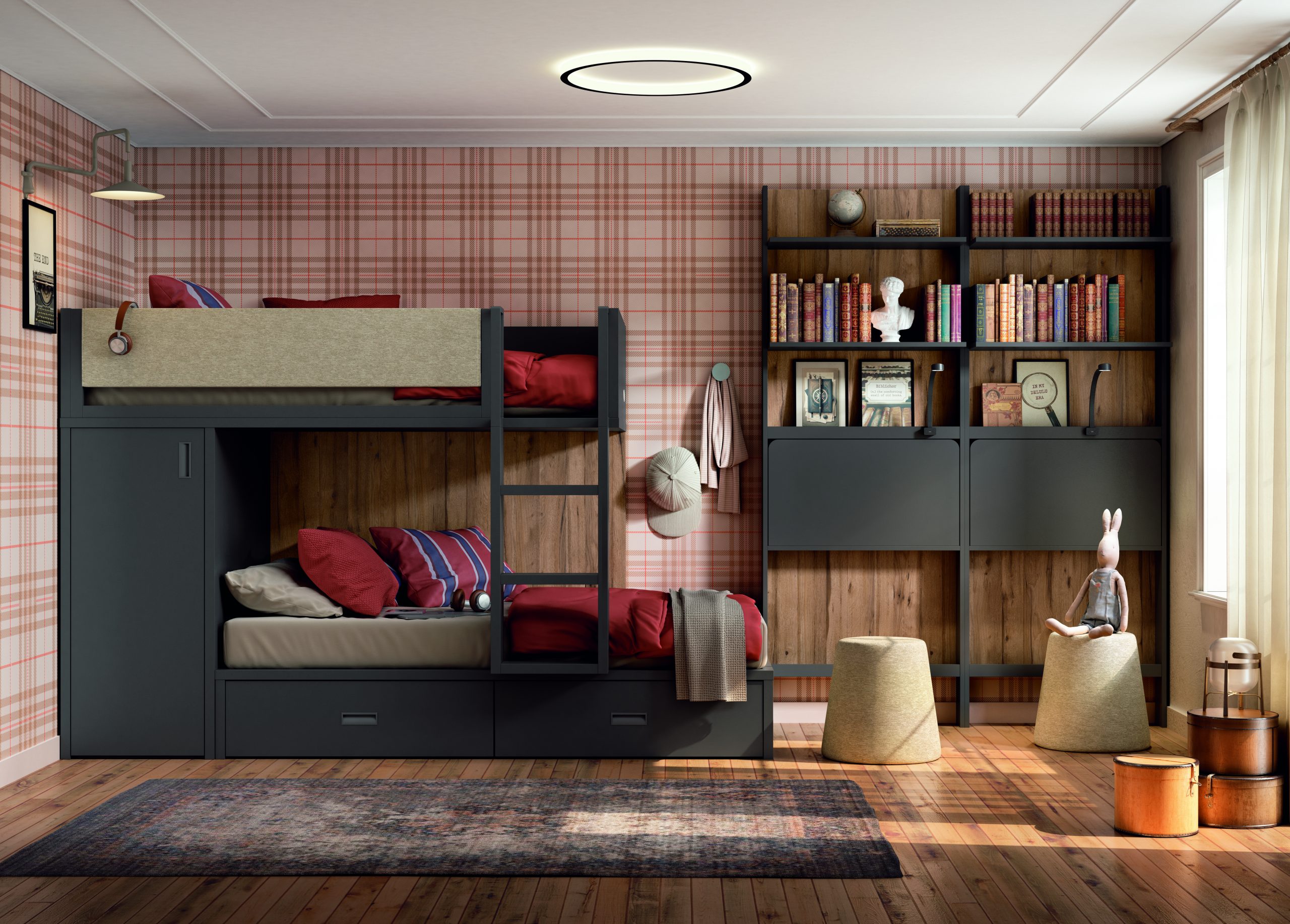 El conjunto se completa con un tren superior con base de bajos de 120,9 cm, acompañado de una cama nido de 32,5 cm y dos cajones nido con ruedas (190 × 90 cm). Esta configuración aprovecha al máximo el espacio disponible y ofrece una solución cómoda y práctica para el descanso diario.