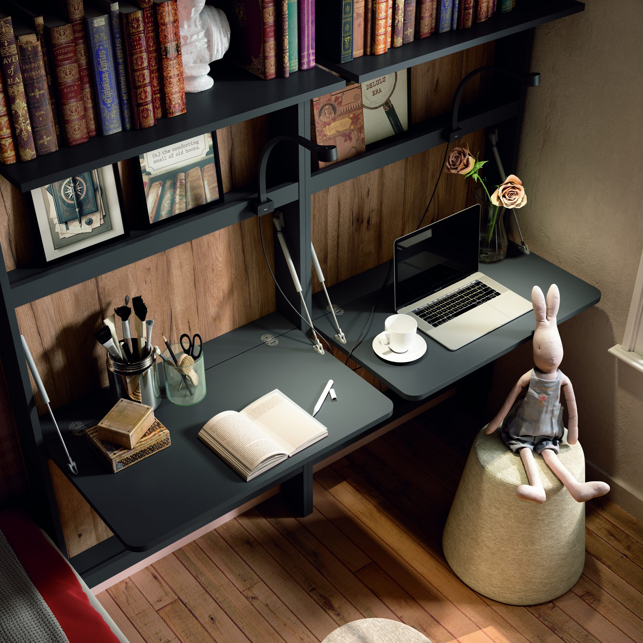 Esta composición incluye una estantería con escritorio abatible (237,8 × 82,3 × 31,9 cm), ideal para combinar zona de estudio y almacenaje en un mismo espacio. Gracias a su diseño compacto, el escritorio se pliega fácilmente, permitiendo mantener la habitación ordenada y despejada.