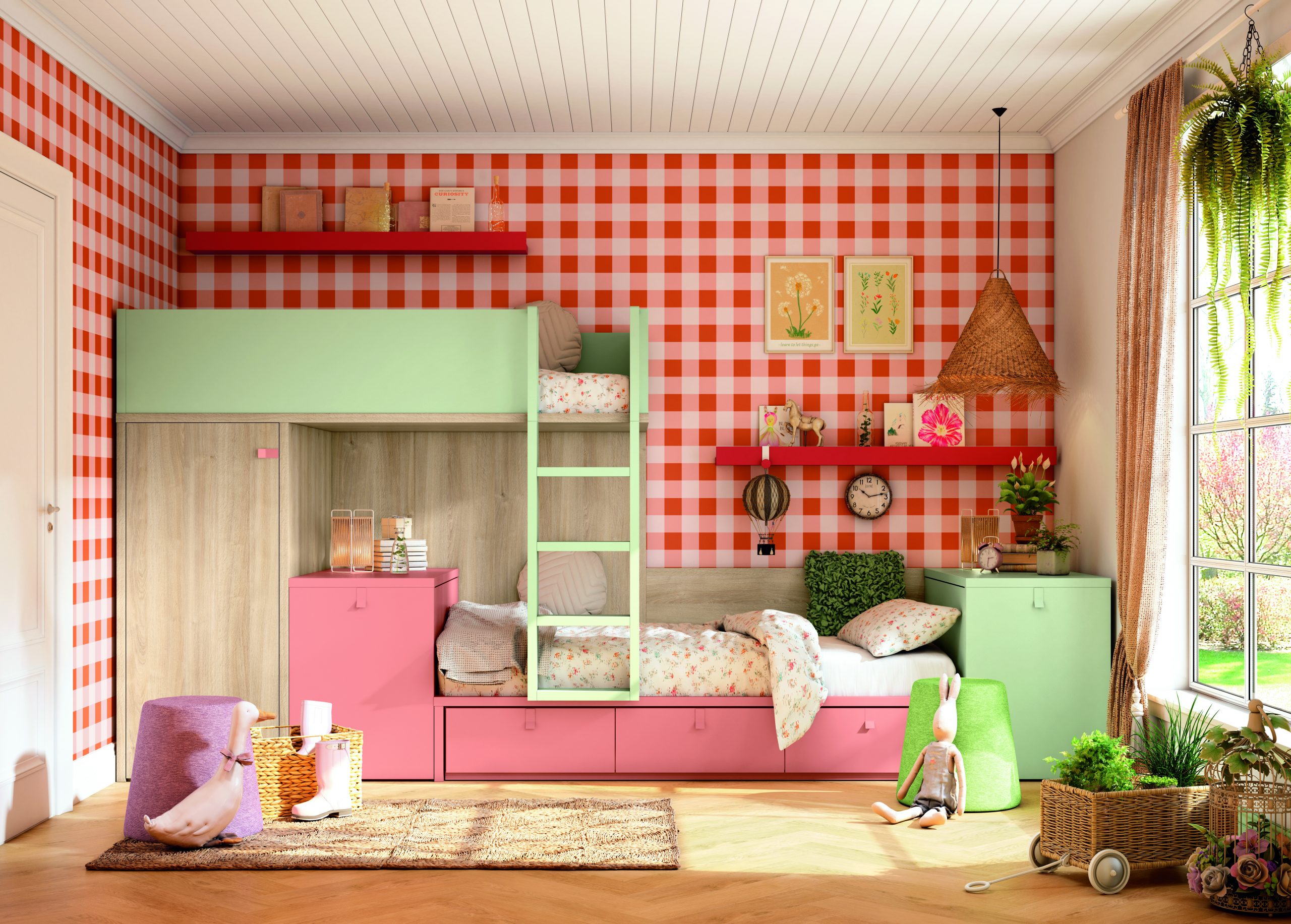 El dormitorio juvenil Ros Delulu 54 destaca por su equilibrio entre modernidad y confort. Su paleta de colores —lino, ópalo, agua y chili— aporta luminosidad y energía al espacio. Además, los tiradores modelo Soul en tonos agua y ópalo añaden un toque distintivo, elegante y fresco que refuerza su carácter juvenil.