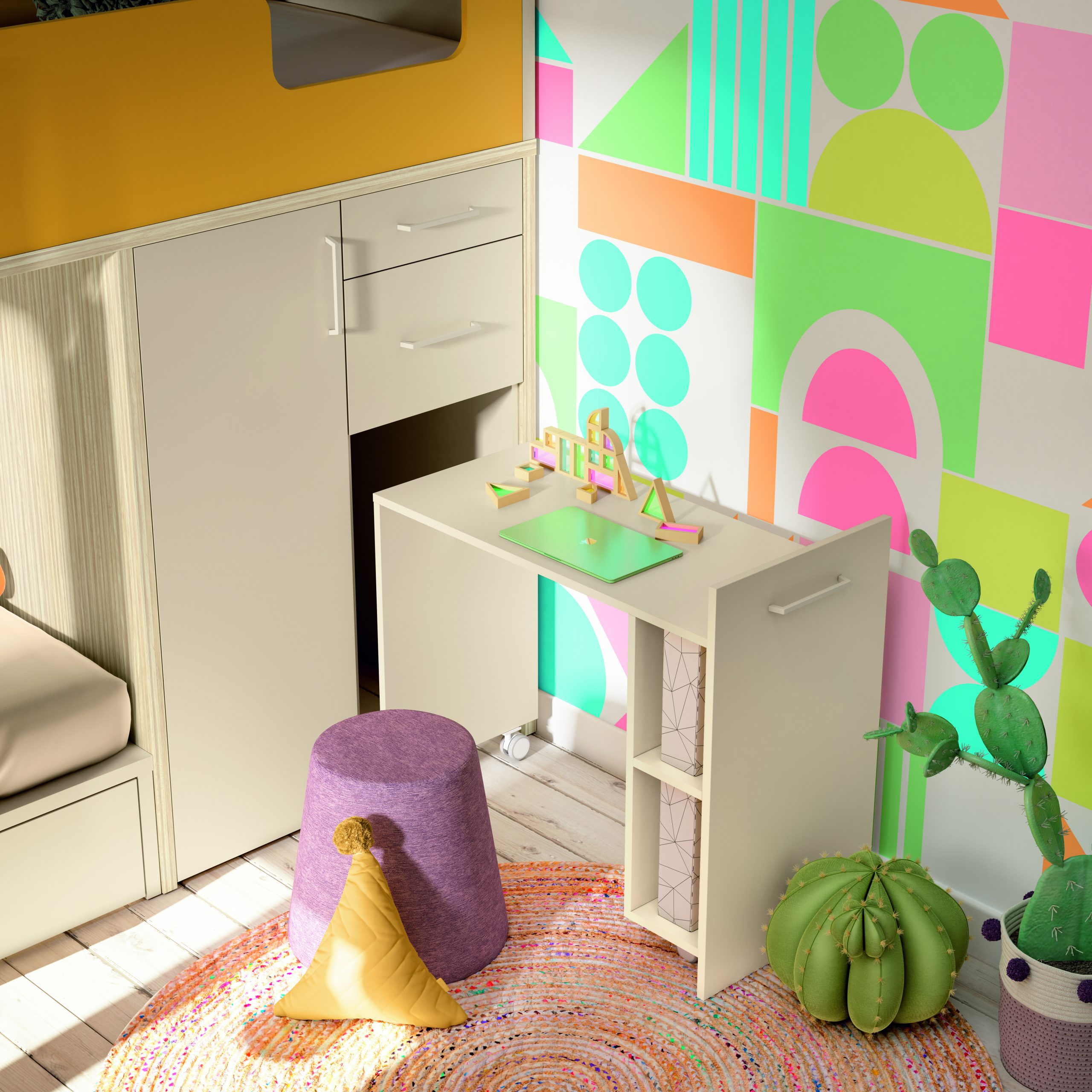 A su lado se integra un módulo con una puerta lateral izquierda (49 cm) que ofrece capacidad para ropa y complementos. El conjunto se completa con un carro de escritorio móvil, equipado con un cajón (16,4 cm) y un contenedor (33,1 cm), ideal para crear una zona de estudio práctica y versátil.